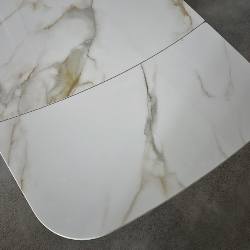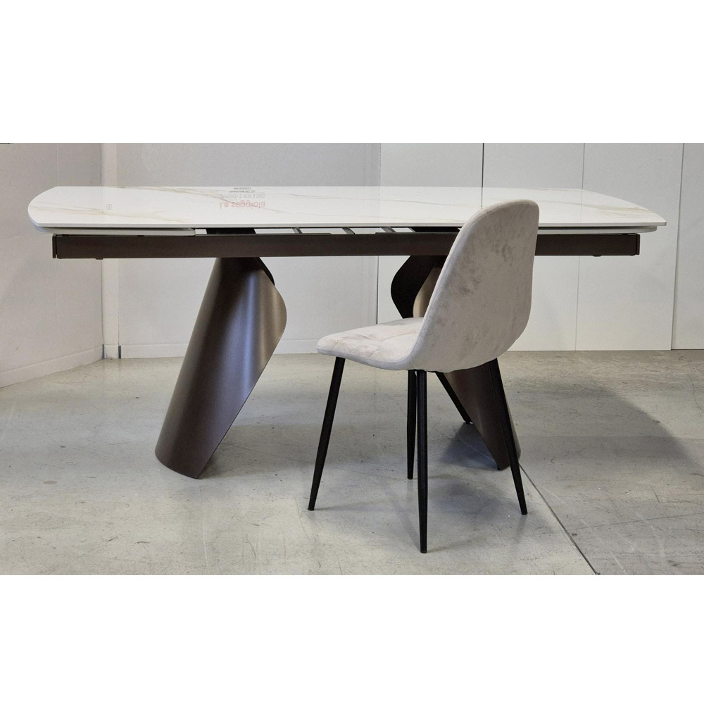 Detta bord i stengods och metall är ett perfekt exempel på modern design som kombinerar stil och funktionalitet . Den eleganta och ljusa stengodsskivan med marmoreffekt förhöjer utrymmet med sina gyllene ådror och glansiga finish som fångar ljuset med naturlig elegans. Den målade metallramen , med sina asymmetriska skulpturala ben , ger bordet dynamik och karaktär, vilket skapar en harmonisk kontrast mellan basens soliditet och skivans visuella lätthet.