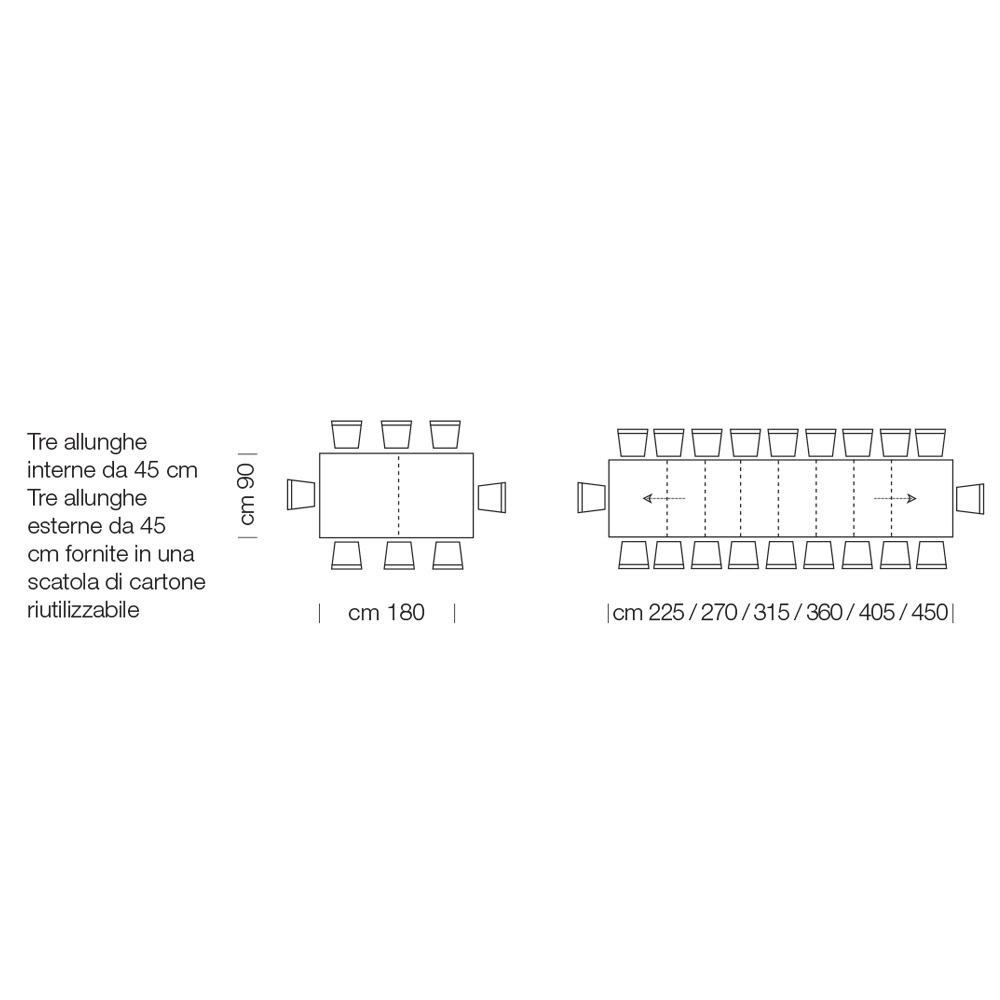 - L 180 (450) x D 90 x H 77 cm 20-sits utdragbar med sex 45 cm förlängningar, tre invändiga och tre levereras i en återanvändbar kartong;