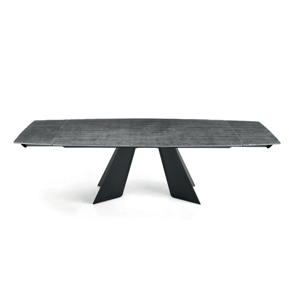 Den distinkta målade metallbasen består av två smala, mjukt V-formade element som smalnar av mot toppen, vilket skapar en elegant och dynamisk struktur. Denna konfiguration ger bordet en visuell lätthet samtidigt som den säkerställer strukturens stabilitet och soliditet.