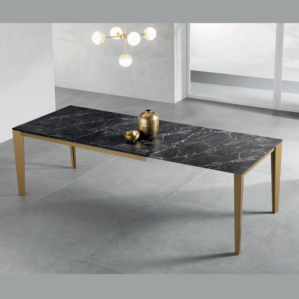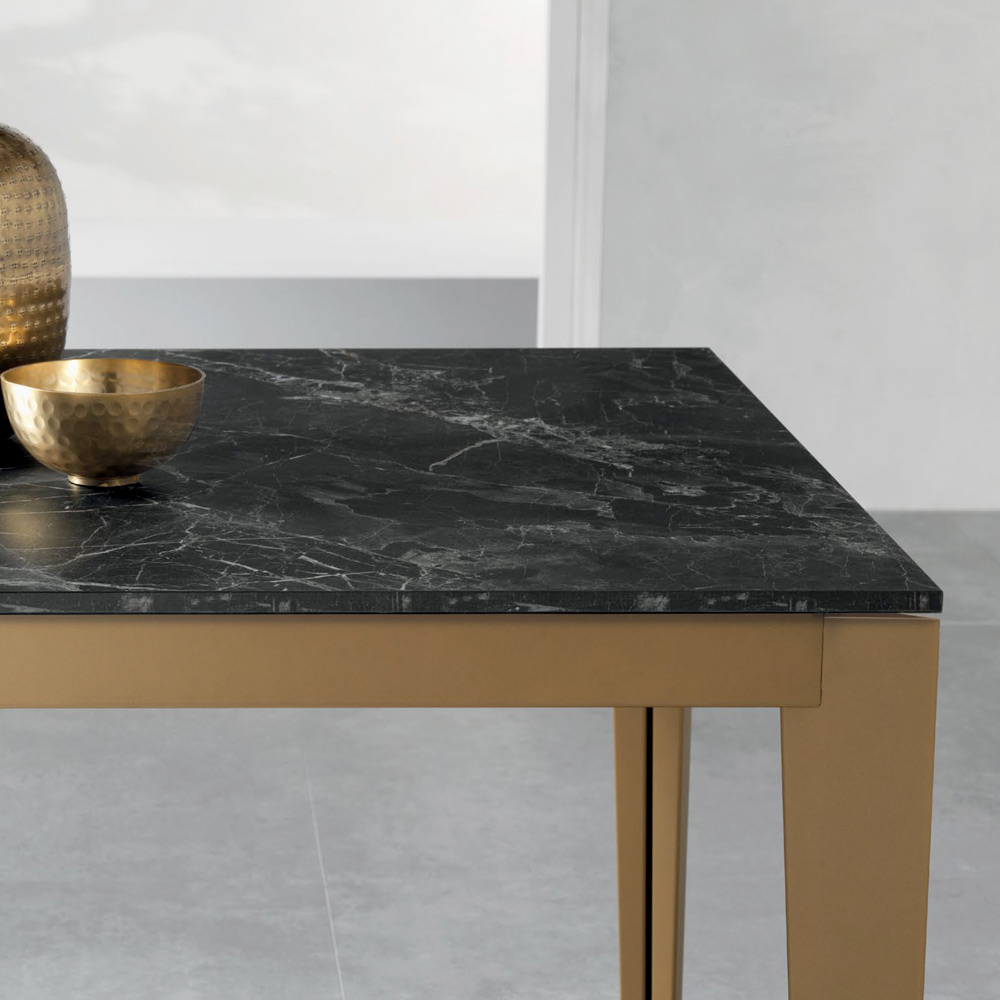 Detta eleganta och funktionella rektangulära bord kombinerar modern design och praktiska egenskaper. Den 18 mm tjocka skivan i mörk marmoreffekt i laminat framhäver marmorns varma, autentiska ådring, medan de åldrade guldmålade metallbenen ger stabilitet och en modern touch.