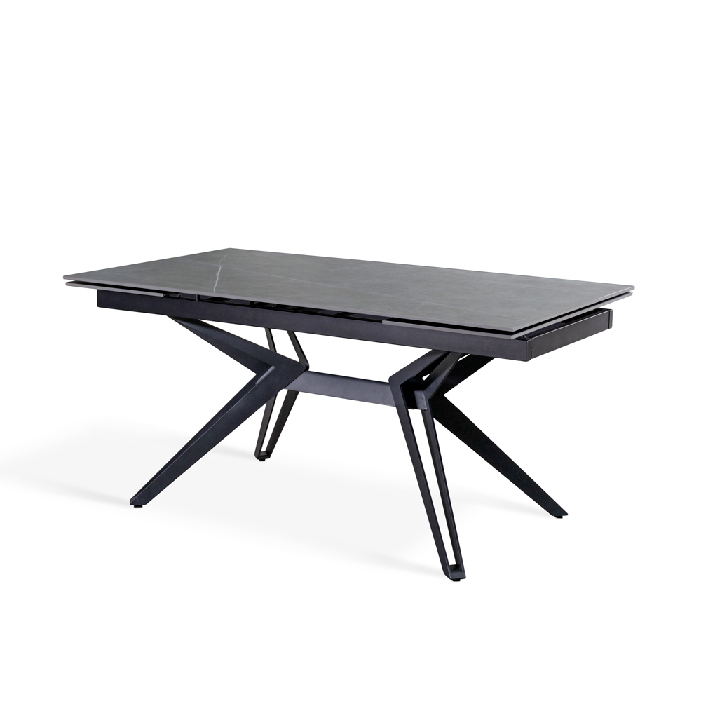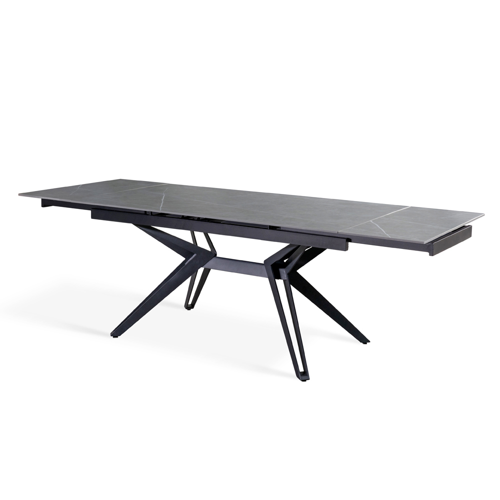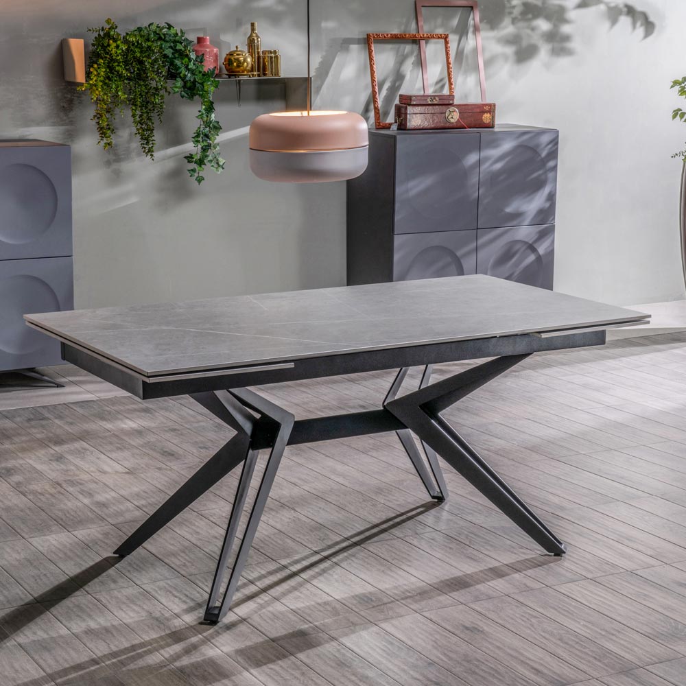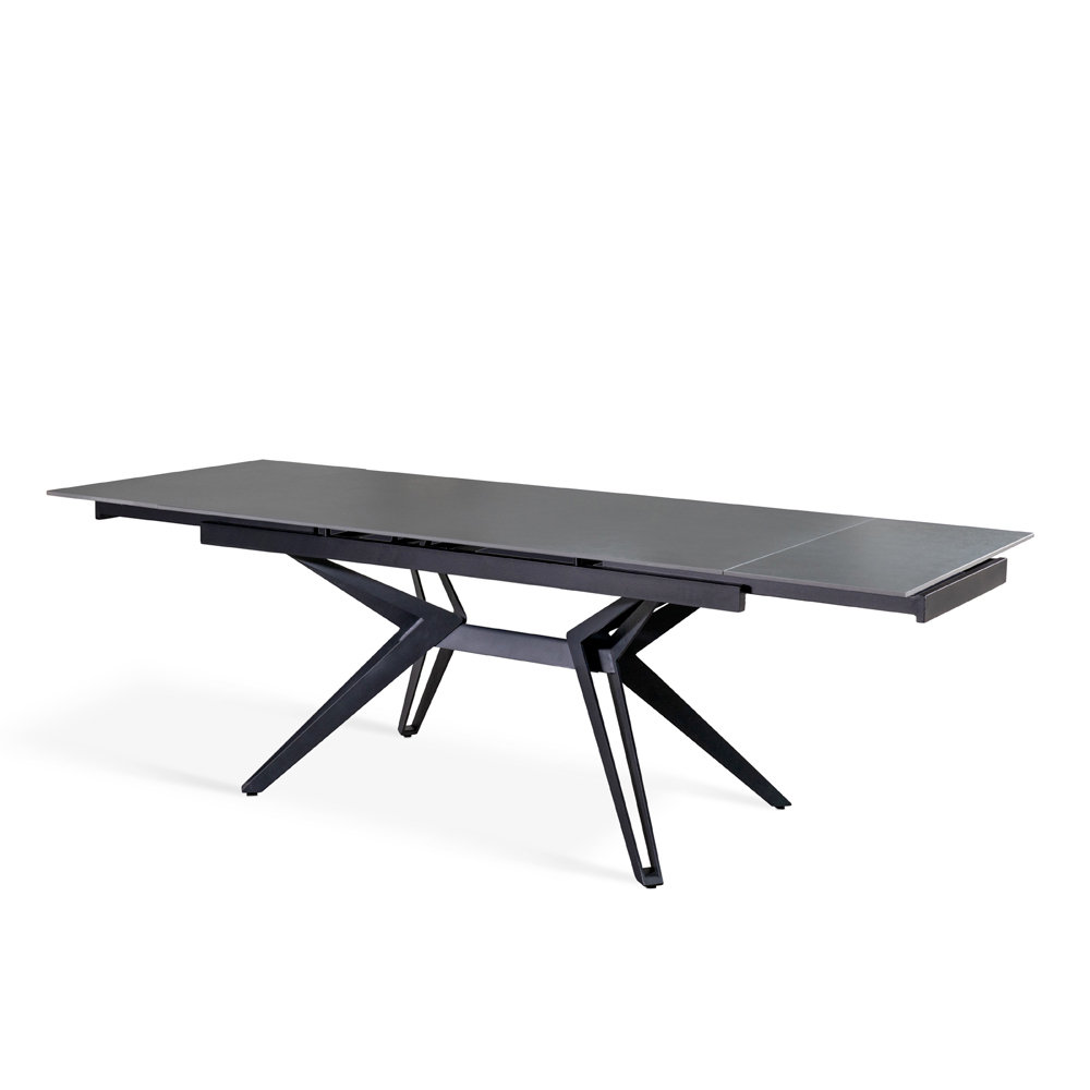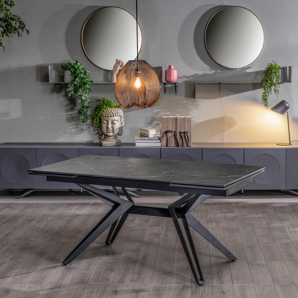 Det som fångar uppmärksamheten är den uttrycksfulla kraften hos detta utdragbara bord i en modern och industriell stil. Dess design kännetecknas av den eleganta toppen av keramik som smakfullt matchar den solida metallbasen. Den erbjuder många möjliga kombinationer mellan finishen på den rektangulära toppen och finishen på basen, vilket tillfredsställer personligt uttryck och smak och återspeglar andan i sammanhanget där den sätts in. Tack vare sin utbyggbarhet kan den rymma upp till 10 personer och blir den perfekta allierade när det gäller att skapa unika och varma gemytliga utrymmen.