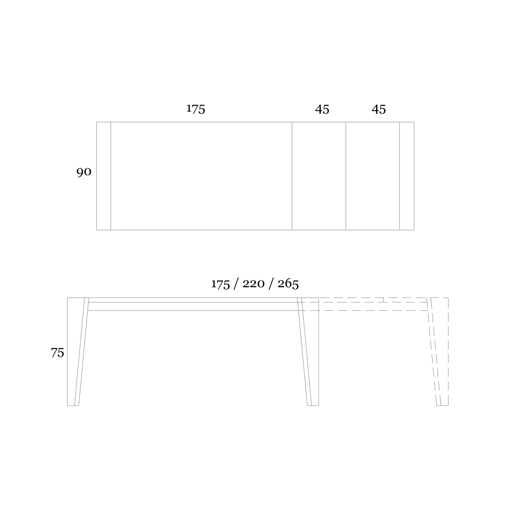 - längd: 175/220/265 cm x djup: 90 cm x höjd: 75 cm - 2 förlängningar