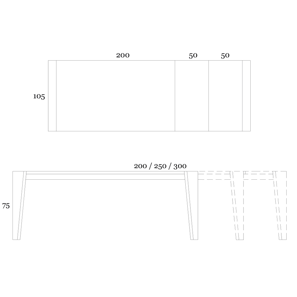 - längd: 200/250/300 cm x djup: 105 cm x höjd: 75 cm - 2 förlängningar