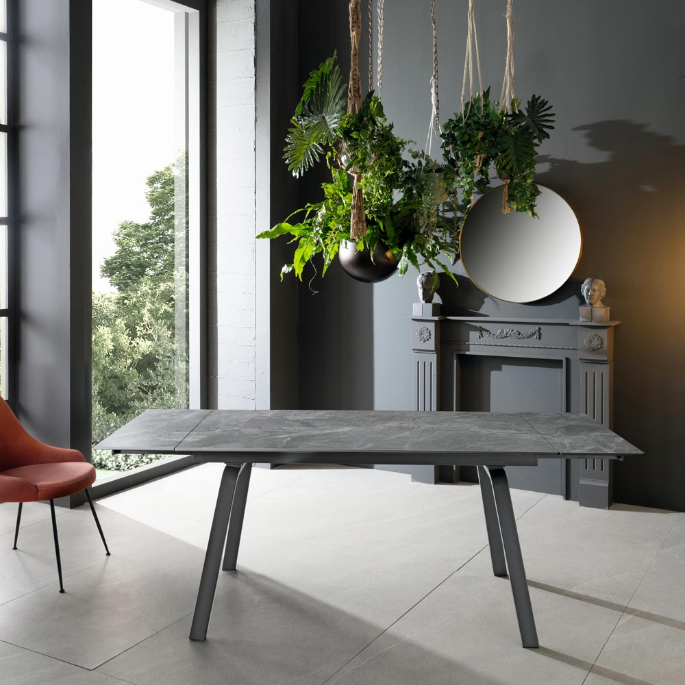 Det som fångar uppmärksamheten är den uttrycksfulla kraften hos detta utdragbara bord i en modern och industriell stil. Dess design kännetecknas av den eleganta toppen gjord av sintrad sten som smakfullt matchar den solida metallbasen. Den erbjuder många möjliga kombinationer mellan finishen på den rektangulära toppen och finishen på basen, vilket tillfredsställer personligt uttryck och smak och återspeglar andan i sammanhanget där den sätts in. Tack vare dess utbyggbarhet lyckas den bli den perfekta allierade i skapandet av unika och varma gemytliga utrymmen.