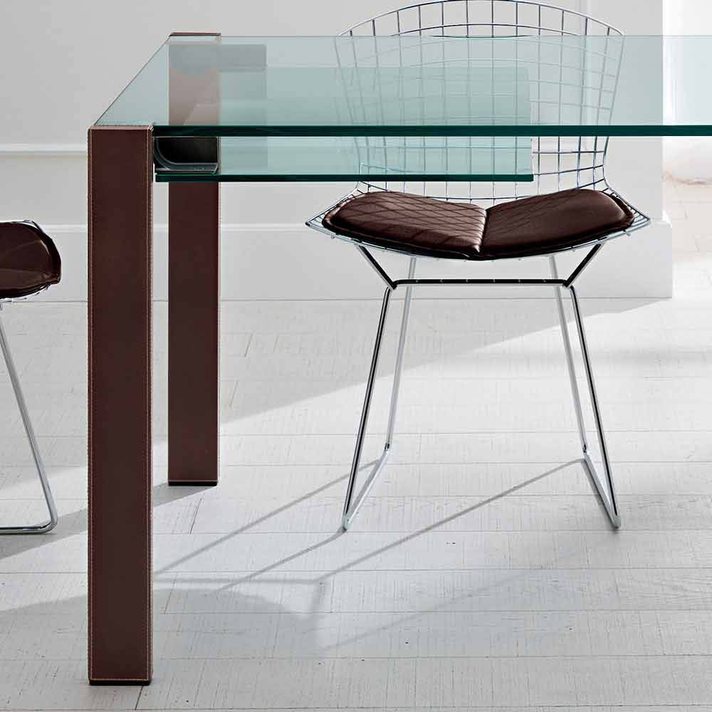 - topp och förlängningar i genomskinligt glas, metallben täckta i mörkbrunt läder;