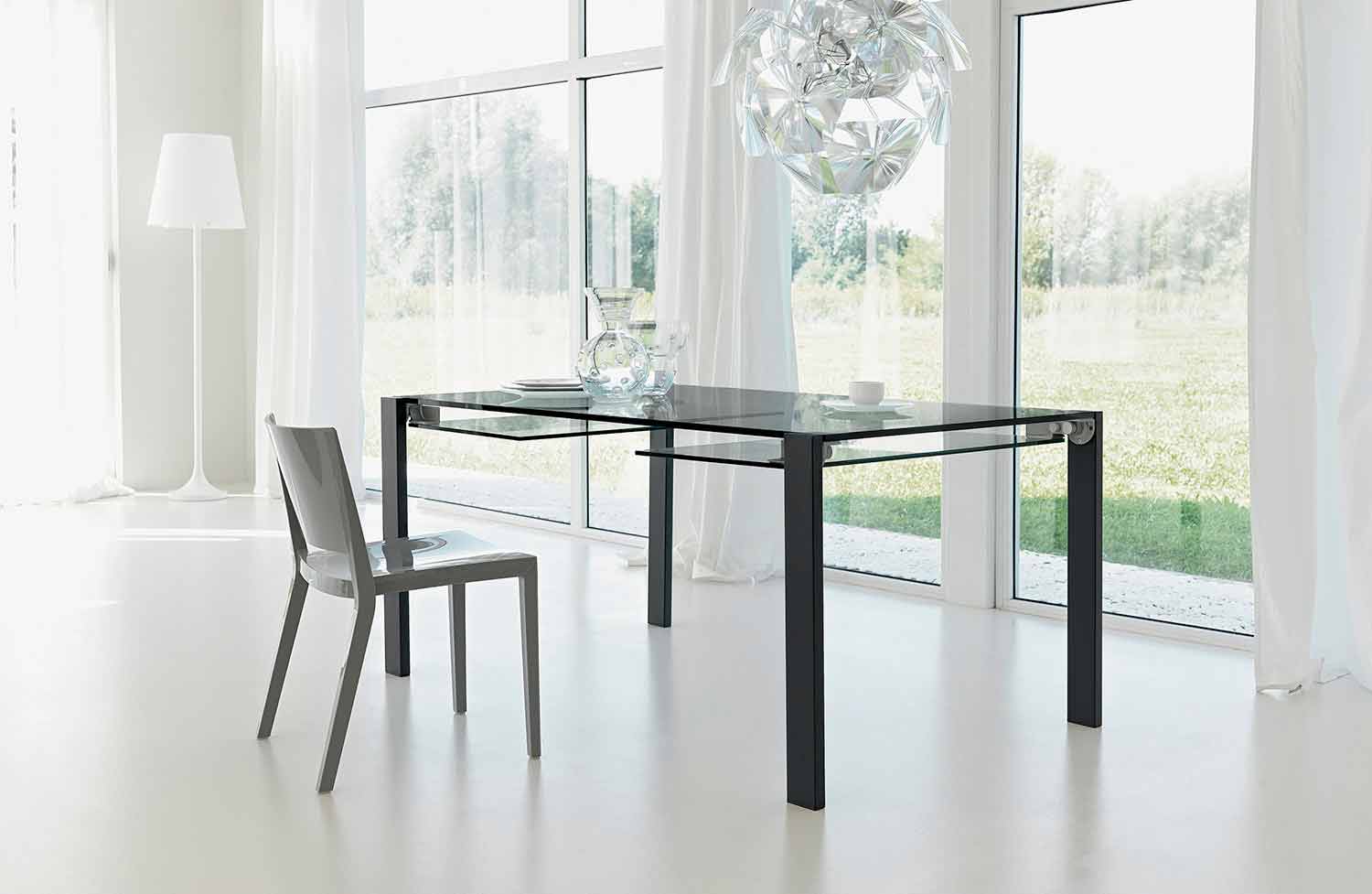 Genomskinligt glasbord förlängningsbart upp till 12 platser med metall eller canaletto valnötbas, tillverkat i Italien.