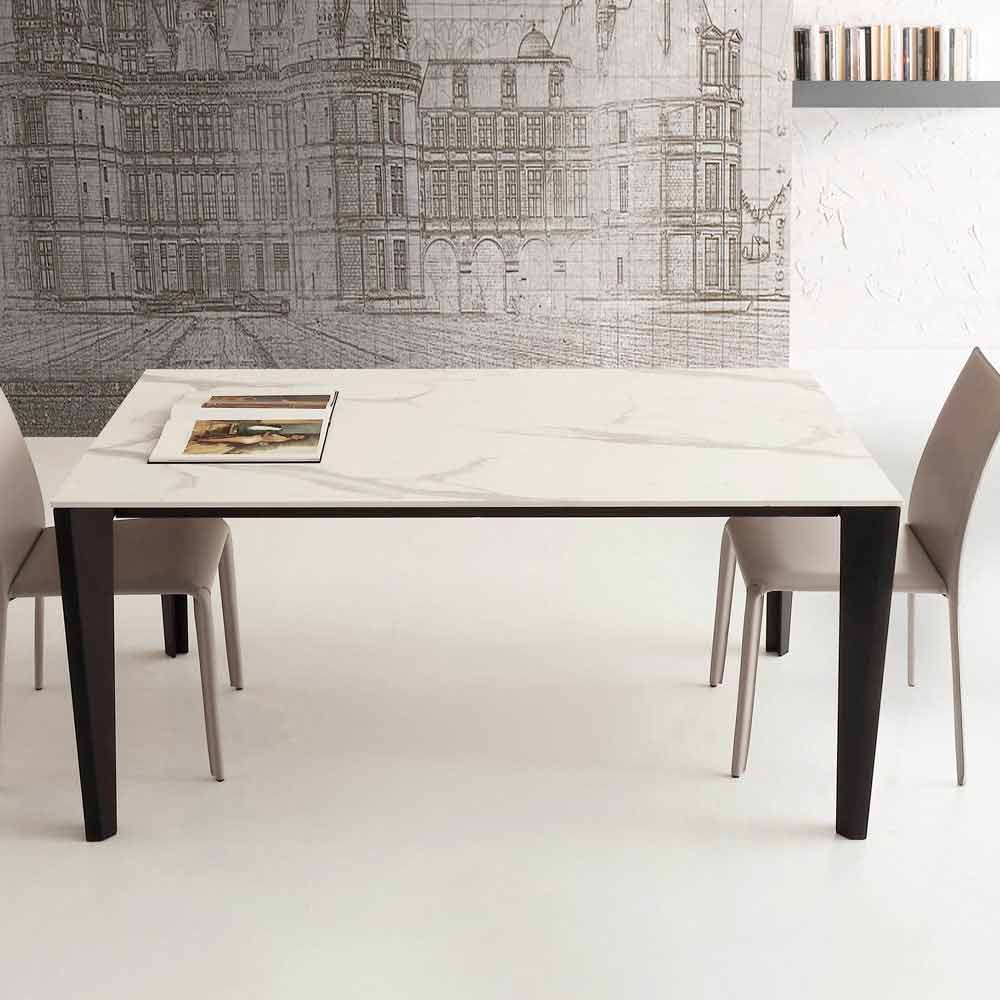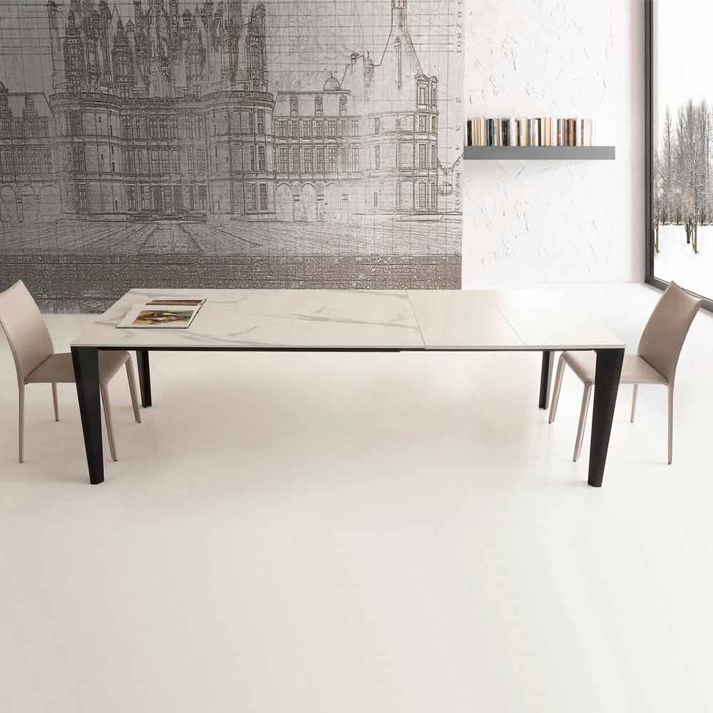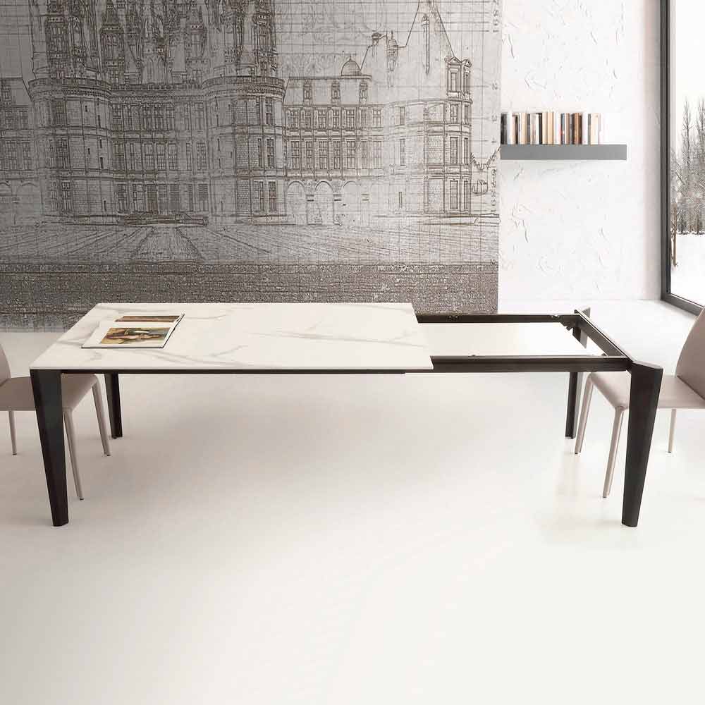 Matbord tillverkat i Italien med utdragbar glaskeramik (12 mm tjock) med Calacatta vit marmoreffekt, vit melaminförlängning och svartlackerad metallbas .