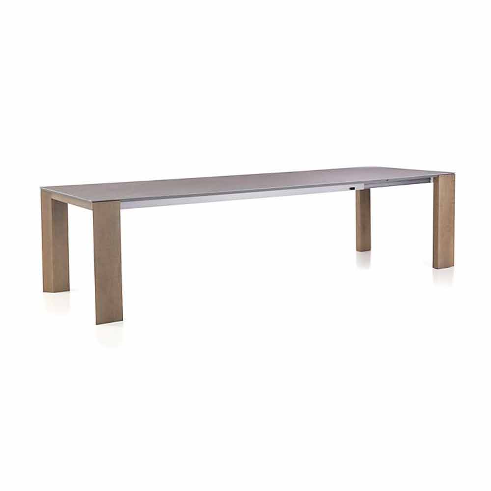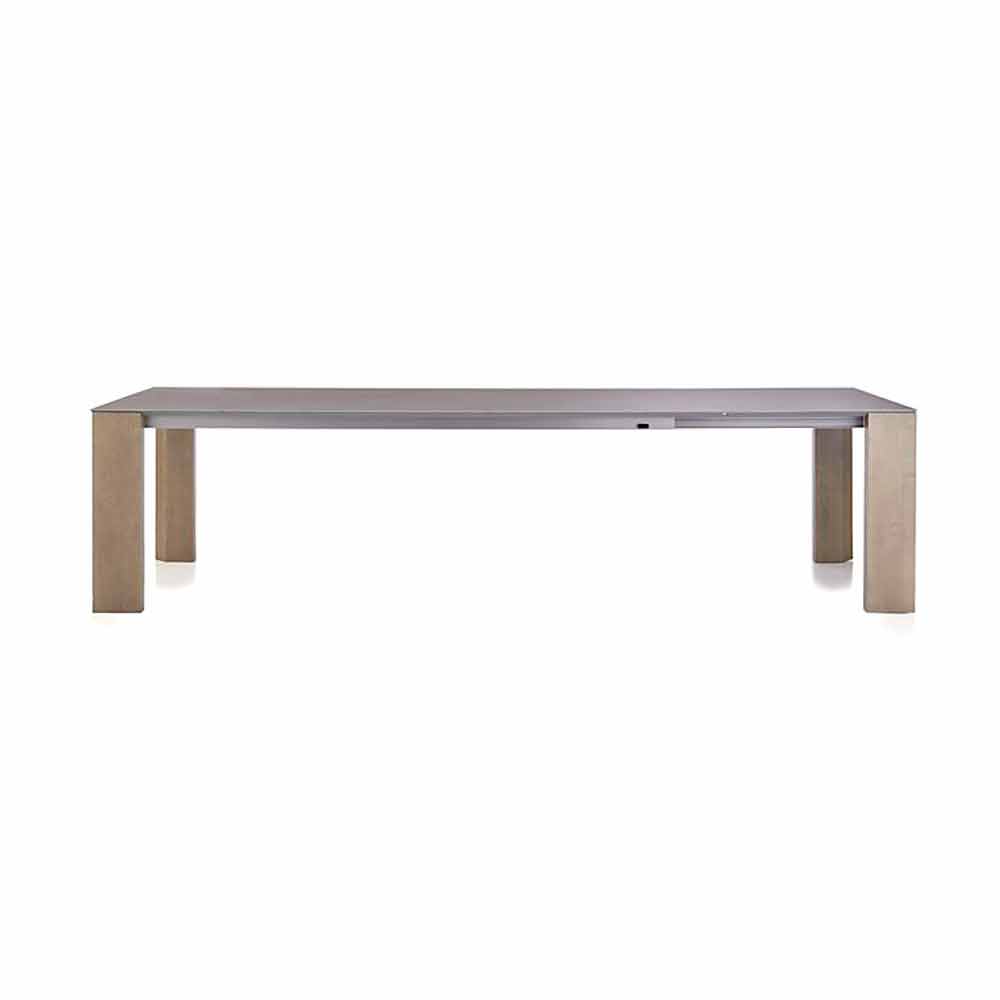 Tanken med denna typ av bordssamling, med riktigt viktiga mått upp till 300 cm i längd, är att erbjuda en lättillgänglig förlängningstjänst. Elegans finns också i en långsträckt position. Denna enkelhet i töjbarhetsfunktionen möjliggörs genom användning av en aluminiumram med integrerade styrningar, som kombinerar ädla traditionella material som trä och keramik genom en modern design som varar över tiden.