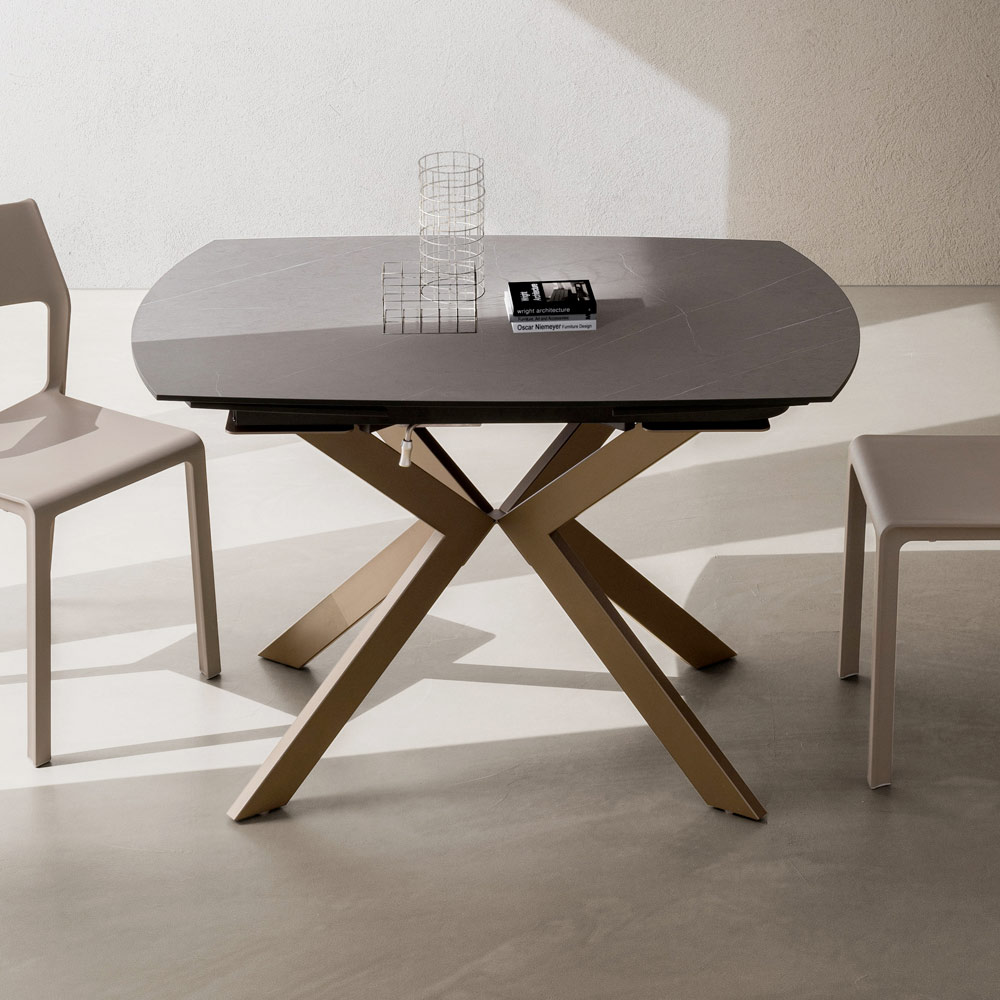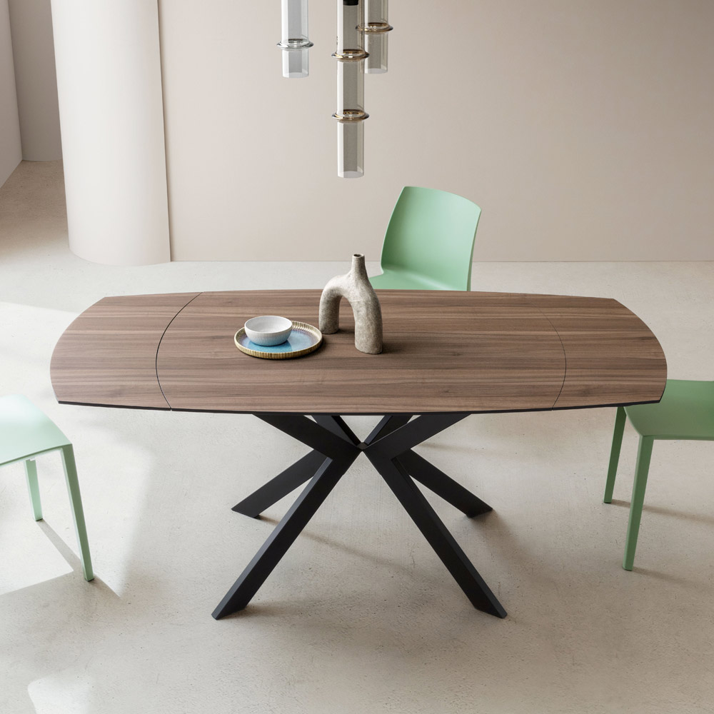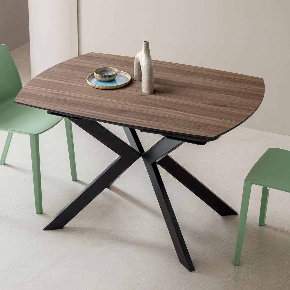 Den målade metallbasen , med stjärnformade korslagda ben , ger soliditet och karaktär och förvandlar bordet till en sann protagonist i rummet.
