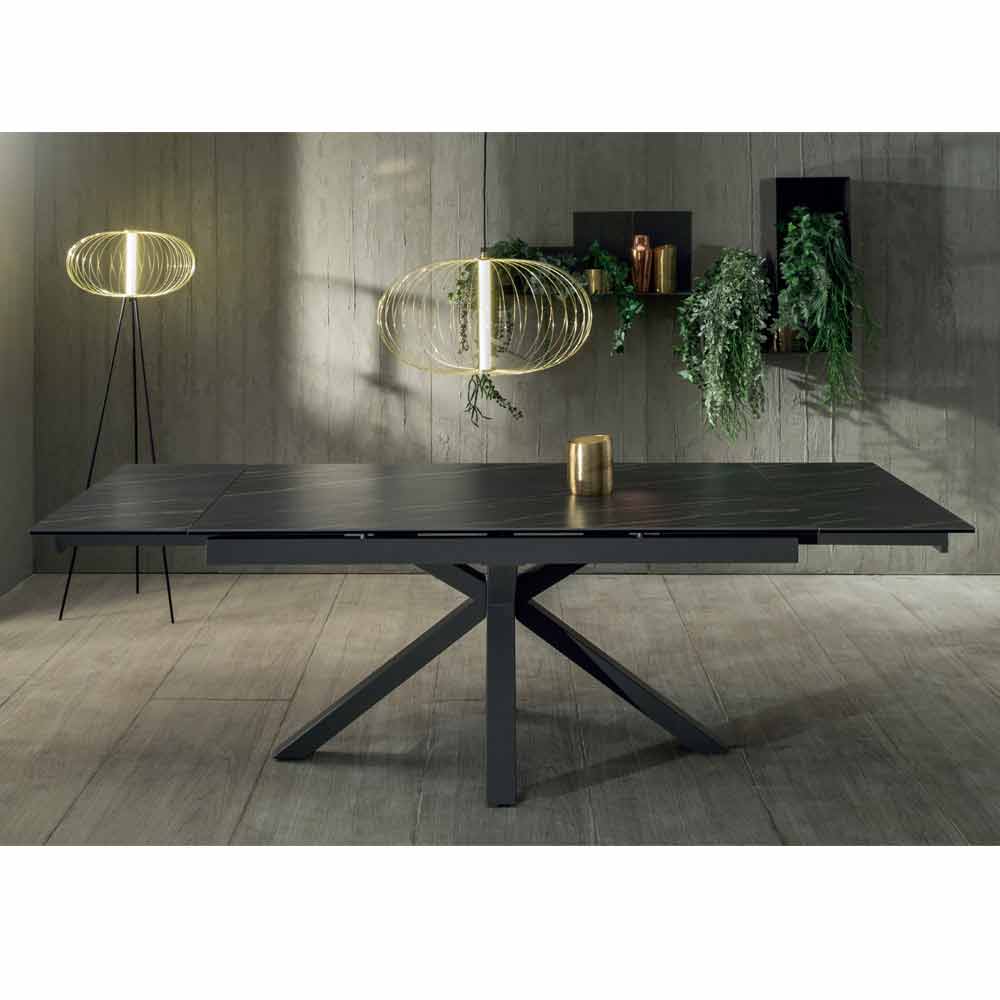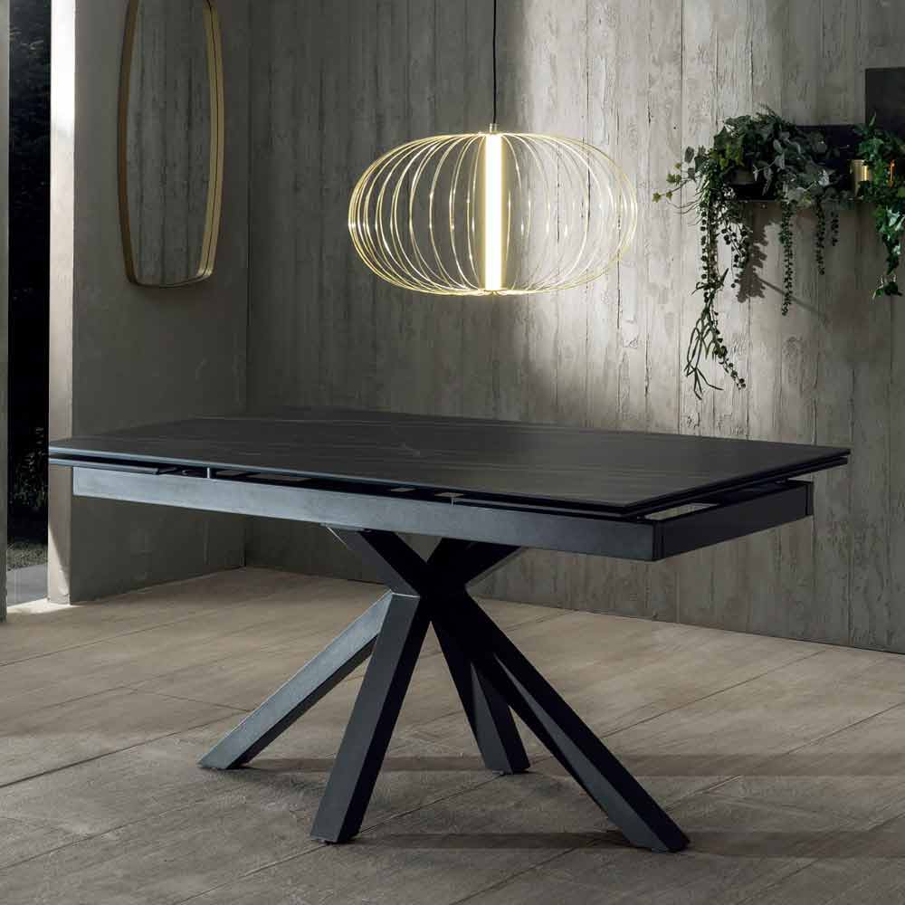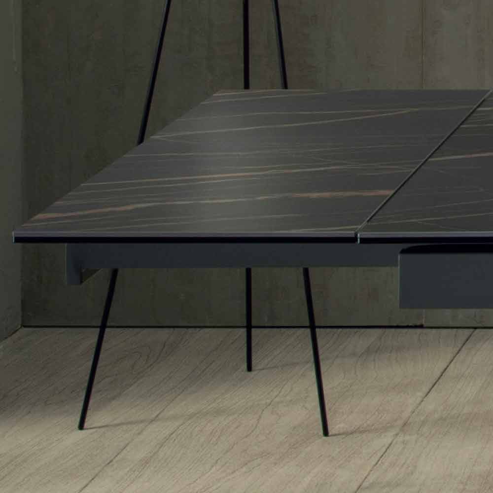 Detta matbord kännetecknas av en elegant design och en stark visuell inverkan som gör att den kan erövra centrum för uppmärksamhet i rummet. Toppen är tillverkad av 6 mm tjock Portoro effekt keramiska under vilka ett 8 mm tjockt skikt av glas är placerad för att ge flexibilitet för att det keramiska, varigenom man undviker skada medan ramen och benen är tillverkade i matt antracit målad metall. Benen representerar en av de grundläggande punkterna eftersom de ger rörelse och en underbar unik design till bordet och hela rummet där det är placerat. Det som utmärker detta underbara matbord är utan tvekan möjligheten att förlänga toppen till en längd av 240 cm tack vare de 2 40 cm förlängningarna i samma yta som toppen och placeras under den. Tack vare den valda kombinationen av material och finish är den här artikeln den perfekta lösningen för inredningsmiljöer som kännetecknas av en modern och raffinerad stil som kräver ett bord som ger personlighet till rummet genom att kombinera skönhet och elegans utan att försumma den grundläggande praktiska och funktionella aspekten. . .