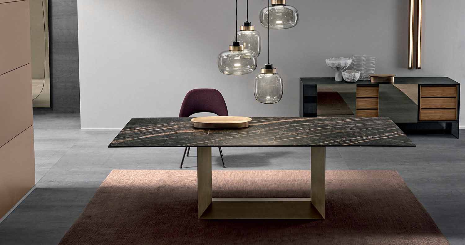 Lyxigt utdragbart bord upp till 12 platser med Noir Desir keramisk topp och bronsmetallfodral, tillverkad i Italien.