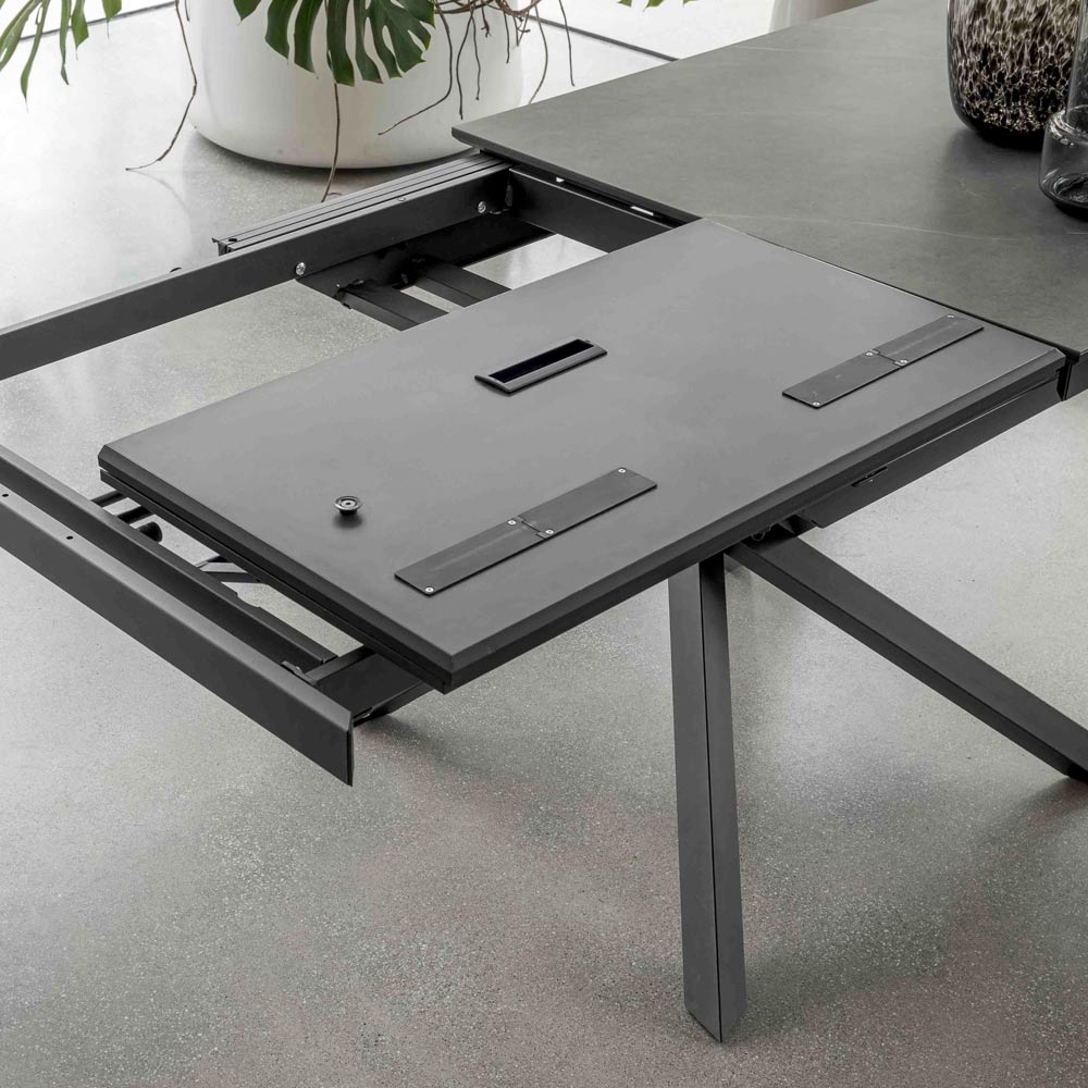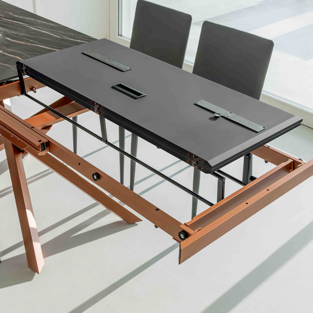 Dess sanna skönhet ligger i dess flexibilitet. Stängt är det ett sobert och elegant bord ; öppen förvandlas den till en generös mottagningsyta . Perfekt för middagar med vänner, kollektiva arbetspass eller som ett mångsidigt utrymme för din familj, den anpassar sig till ögonblickets behov med en flytande och enkel övergång.