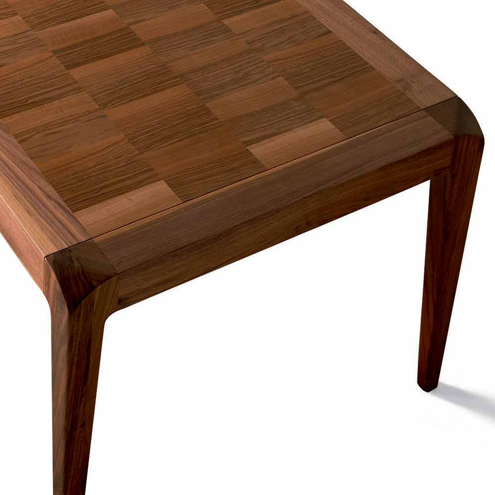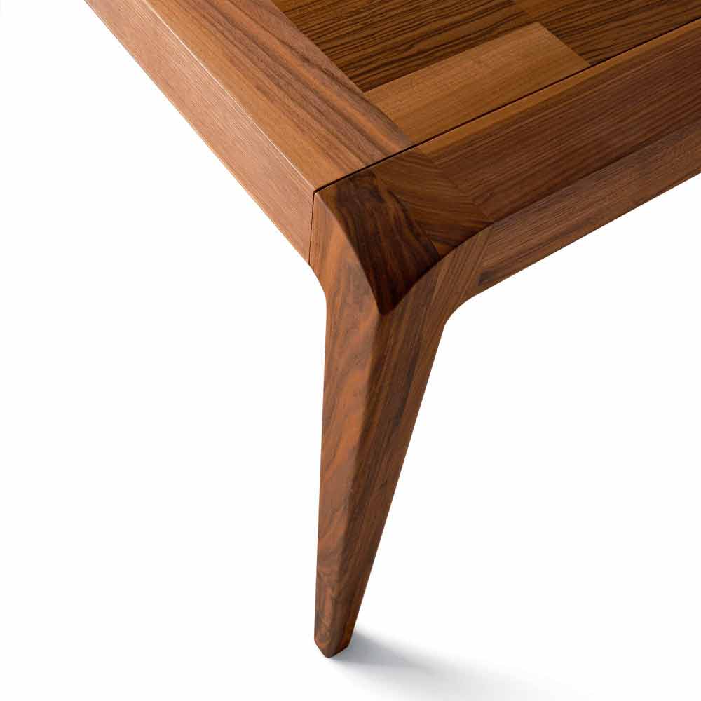 Utdragbar bord med golvplattan med naturliga valnöt inlägg. Ram och ben i massiv valnöt. Förlängningar med substratgrupper. Tabellen belyser för noggrann bearbetning av planen, en samtida inlägg som går bra med den böjda rörelsen av benen som inte skapar hörn.