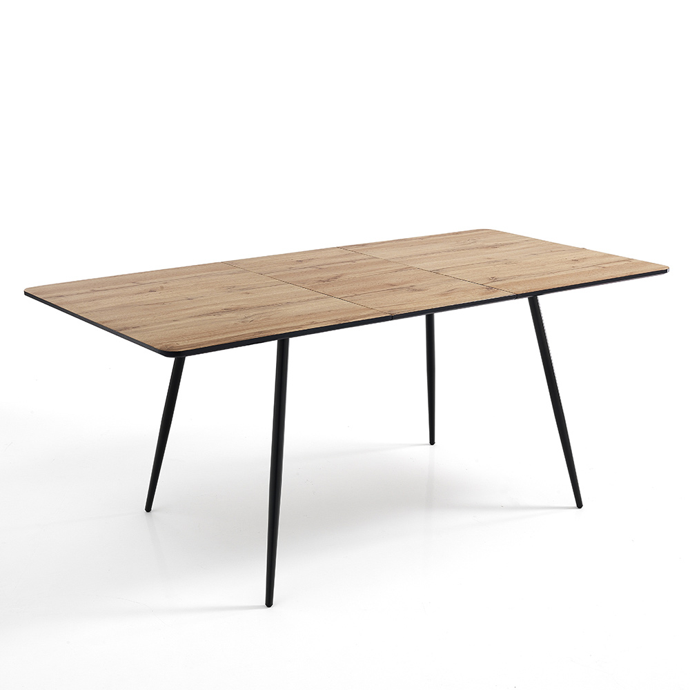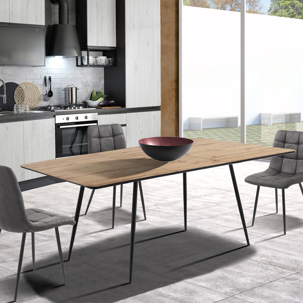 Utdragbart matbord upp till 160 cm med MDF-skiva klädd i rå ekmelamin med mattsvart kant och ben av mattsvartlackerad metall . Stretch placerad under toppen. Tack vare möjligheten att utökas kan den ta emot ett större antal vänner och släktingar att tillbringa trevliga kvällar i sällskap.