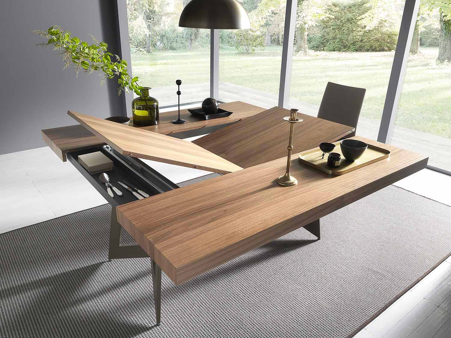 utdragbara bord har en mjuk och naturalistisk design, med geometriska och eleganta linjer.