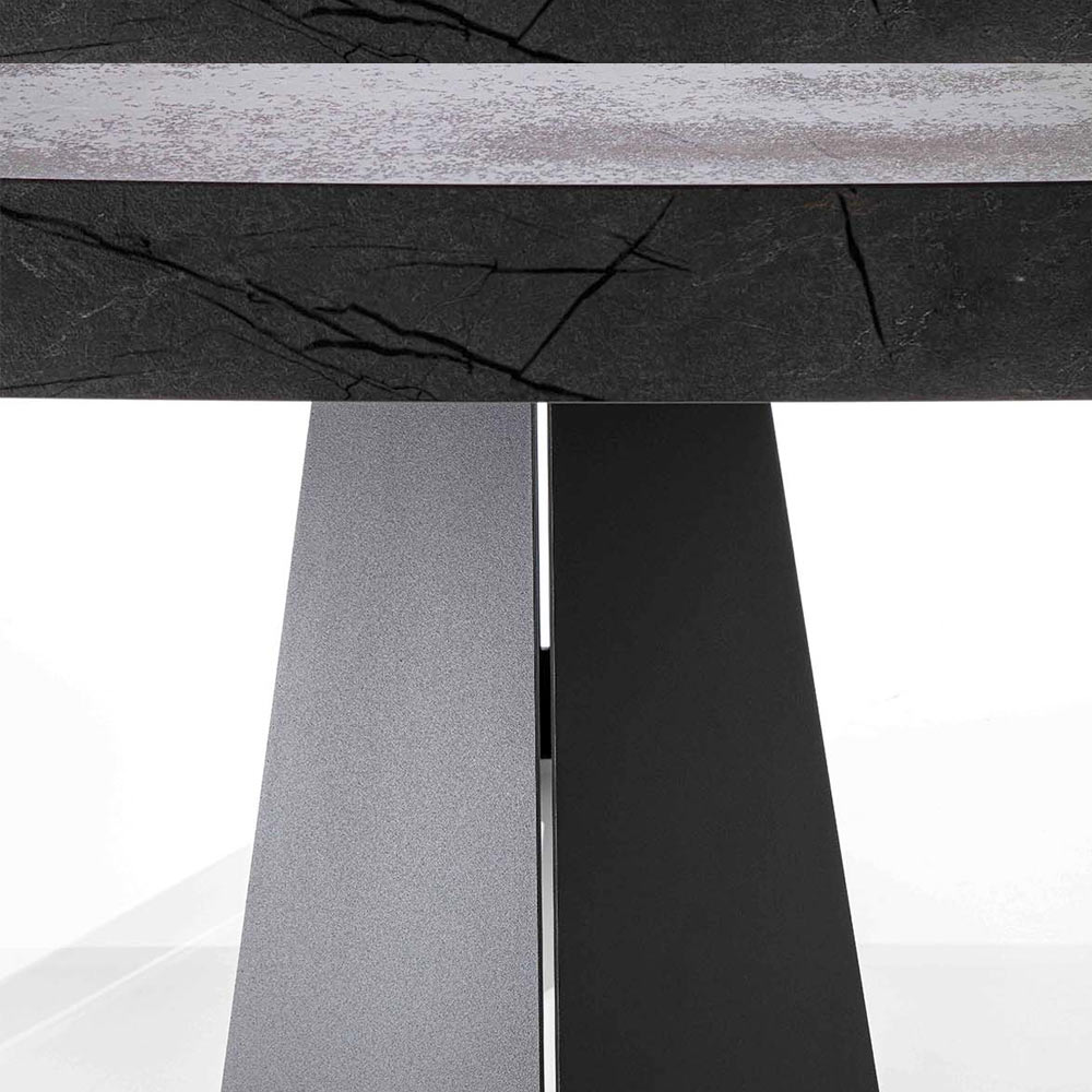 Dess design görs unik och avantgardistisk av den speciella svarta basen som tack vare sina ovanliga linjer berikar sin estetik och ökar sin starka karaktär, vilket gör det till ett perfekt matbord som kan komplettera inredningen i stilfulla miljöer. modernt och raffinerat. De olika ytbehandlingarna som finns tillgängliga för toppen tillåter också att öka dess