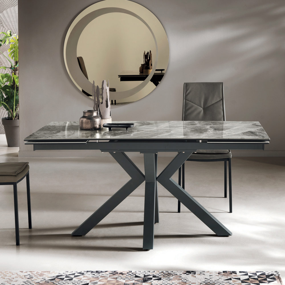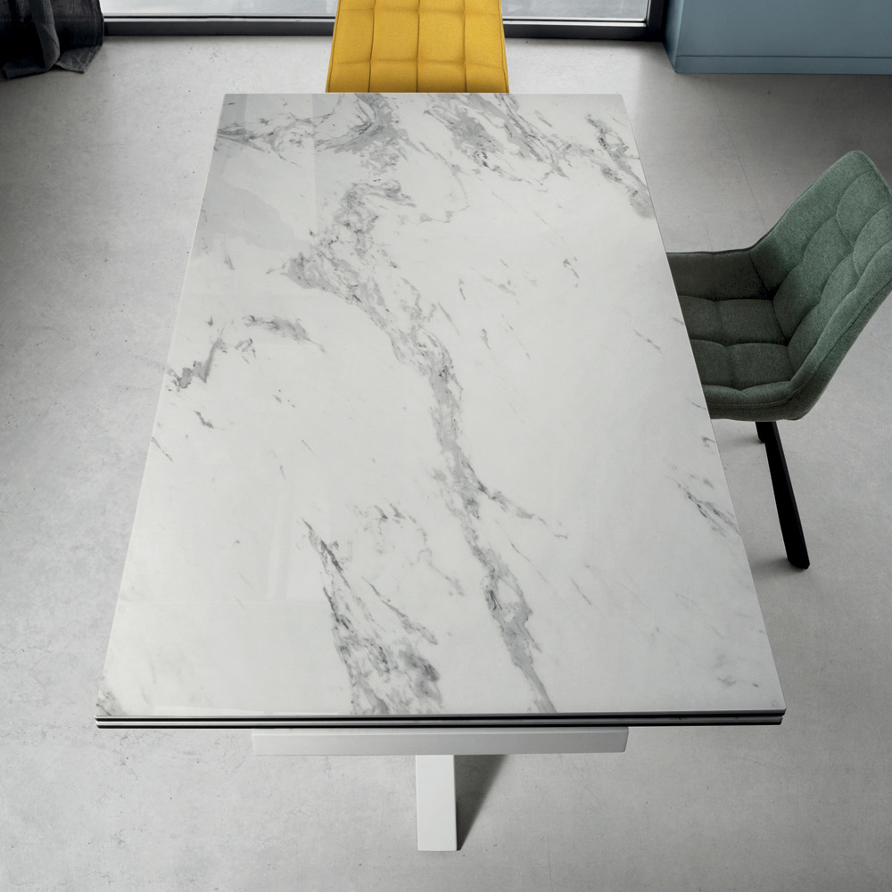 Utdragbart matbord med marmor-effekt porslinsskiva i stengods och målad metall underrede med enkla och moderna linjer, kapabel att ge karaktär åt din miljö. Utrustad med 2 sidoförlängningsskivor på 40 cm och en rotationsmekanism som gör att du snabbt och enkelt kan förlänga bordsskivan för ett funktionellt och särskilt originellt resultat.