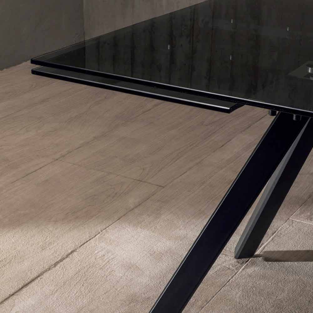 Produktens designaspekt är utan tvekan tilldelad av den raffinerade härdade glasskivan i transparent rökt svart yta i kombination med matt antracitmålad metall i strukturen som kännetecknas av de sneda benens egenskaper som gör produkten unik i sitt slag. Praktik och funktionalitet ges istället genom möjligheten att förlänga toppen upp till 240 cm så att den rymmer högst 12 personer för familjeluncher och middagar. Detta sker tack vare närvaron av 2 laterala förlängningar av 40 cm vardera, också i rökt svart glas, placerad under den övre och lätt avlägsningsbar när så är nödvändigt.