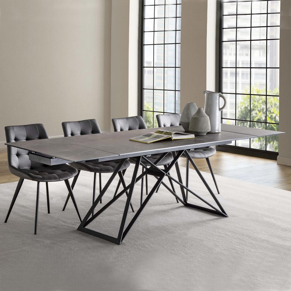 Underbart matbord med keramisk glasskiva , grafitfinish och svartlackerad stålkonstruktion. Vad som gör detta bord unikt och särskilt funktionellt är möjligheten att förlänga toppen, vilket möjliggör en total längd på 240 cm och därmed tillåta ett större antal gäster under sina luncher eller middagar med vänner. Dess design kännetecknas av elegans och en stark personlighet som ges av den perfekta kombinationen av material och ytor som berikar produktens estetik och ger en avantgarde och extremt raffinerad touch.