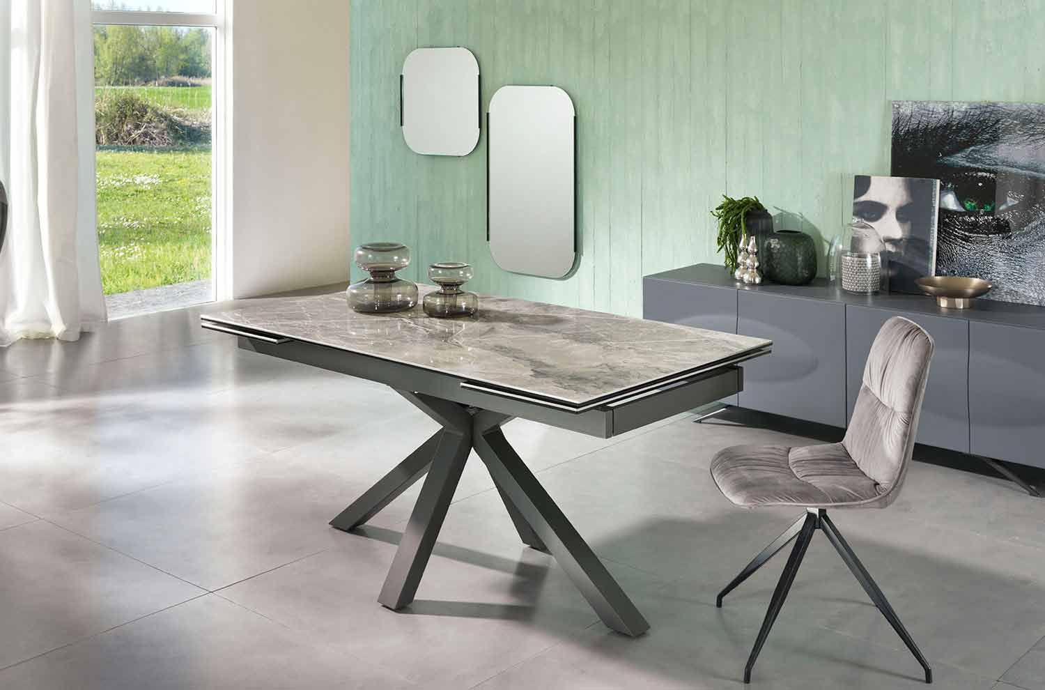Laryssa är ett matbord som kännetecknas av användningen av innovativa och motståndskraftiga material som gör det till ett perfekt bord för matsalen eller köket, som kombinerar skönhet och funktionalitet, vilket möjliggör optimal användning och samtidigt ger stil till alla miljöer. Bordet är tillverkat med en antracitmålad metallstruktur och en keramisk topp på härdat glas, även i antracitfärg, vilket gör bordet solid och beständigt. Förlängningarna är inuti bordet och är också gjorda av keramik på antracitfärgat glas.