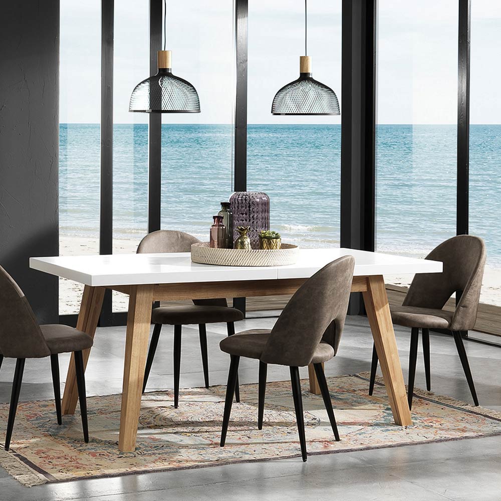Matbord med skiva av halvblank vitlackerad MDF (tjocklek 5cm) och massiv trästruktur med ekfinish. En imponerande och modern design som kännetecknas av enkla och linjära former för ett resultat med hög mångsidig användning . Dess funktionella sida är understruken och framhävd av de 4 förlängningarna på 35 cm vardera placerade under toppen som gör att bordet kan nå en maximal längd på 270 cm. Denna egenskap gör den perfekt för dem som älskar att organisera luncher och middagar med vänner och därför kräver ett utrymme som kan välkomna alla sina gäster på ett optimalt sätt.