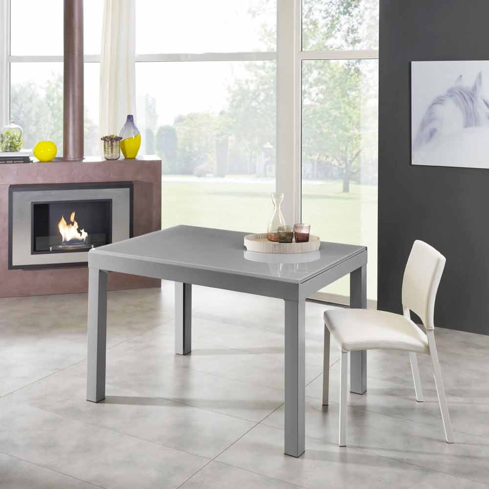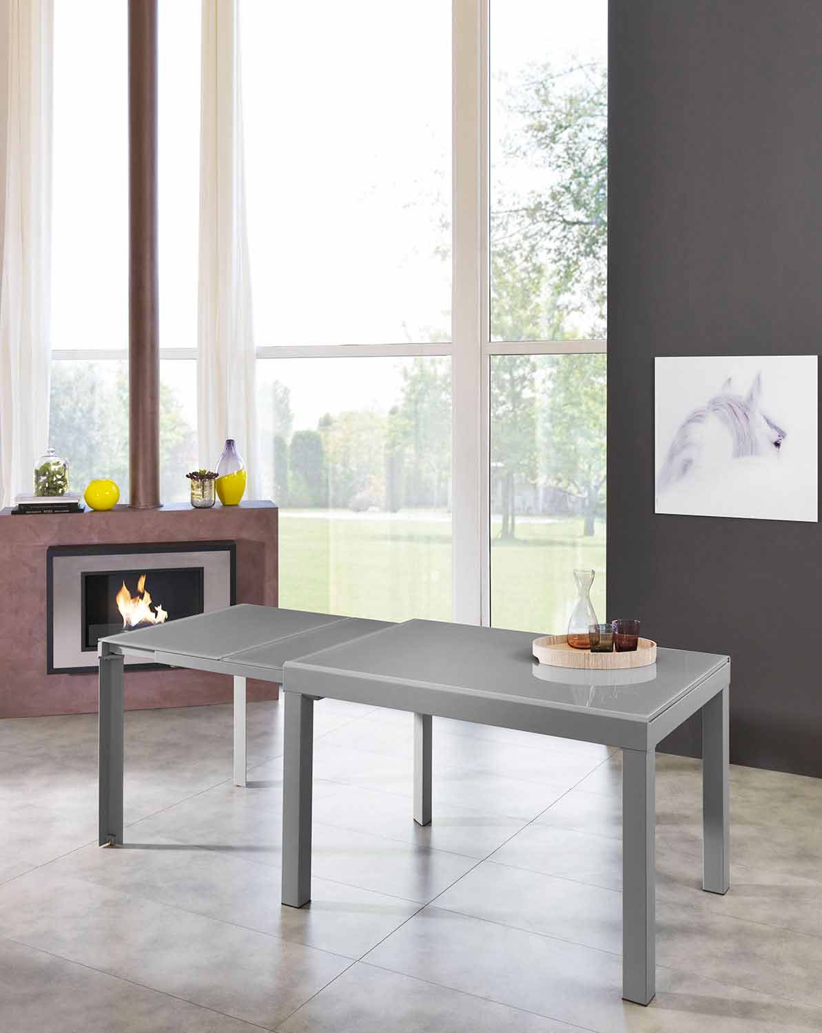 Bordet är tillverkat med en gråmålad metallstruktur och härdat glas och melaminskiva i samma färg samt invändiga förlängningar, även i grått härdat glas.