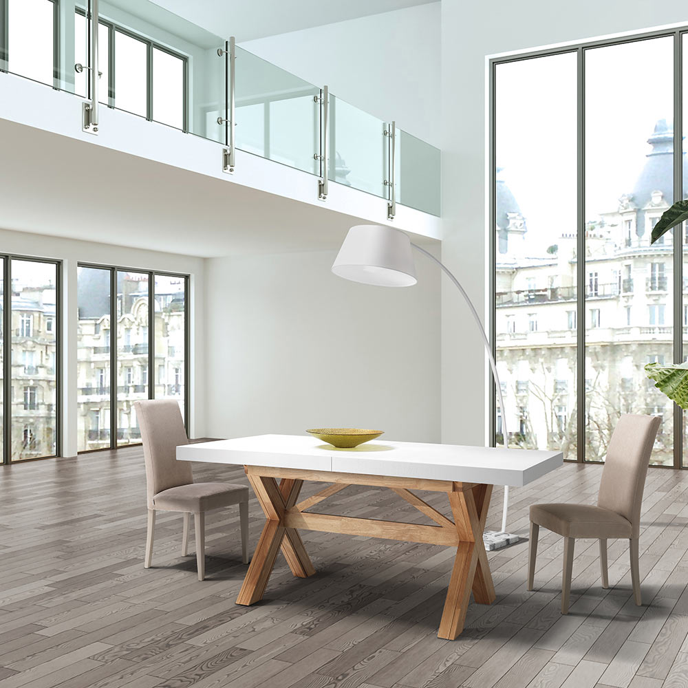 Matbord i massivt trä med öppen porer vitmålad utdragbar skiva och underrede i ekfinish. En imponerande och modern design som kännetecknas av enkla och linjära former för ett resultat med hög mångsidighet . Dess funktionella sida är understruken och framhävd av de 4 förlängningarna på vardera 45 cm placerade under toppen som gör att bordet kan nå en maximal längd på 360 cm. Denna funktion gör den perfekt för dig som älskar att organisera luncher och middagar i sällskap och därför kräver ett utrymme som kan ta emot alla deras gäster på ett optimalt sätt.