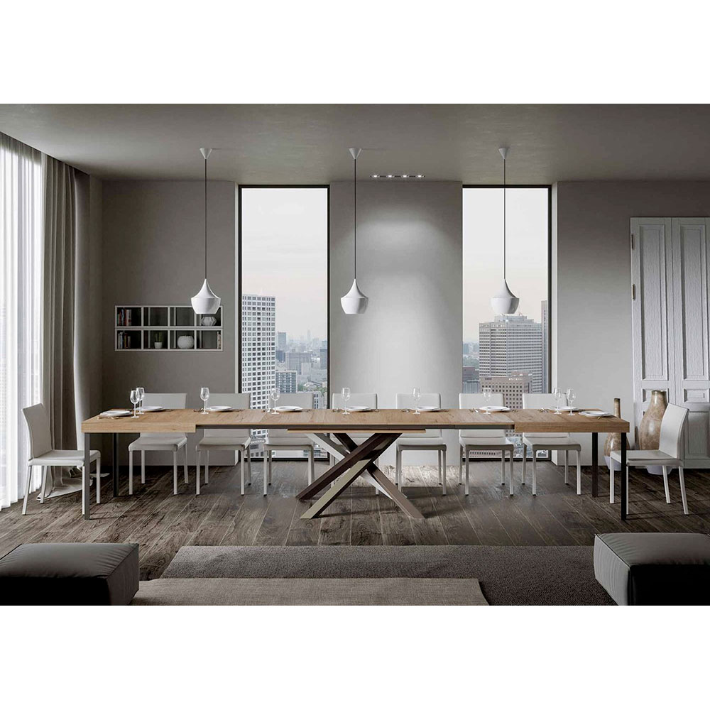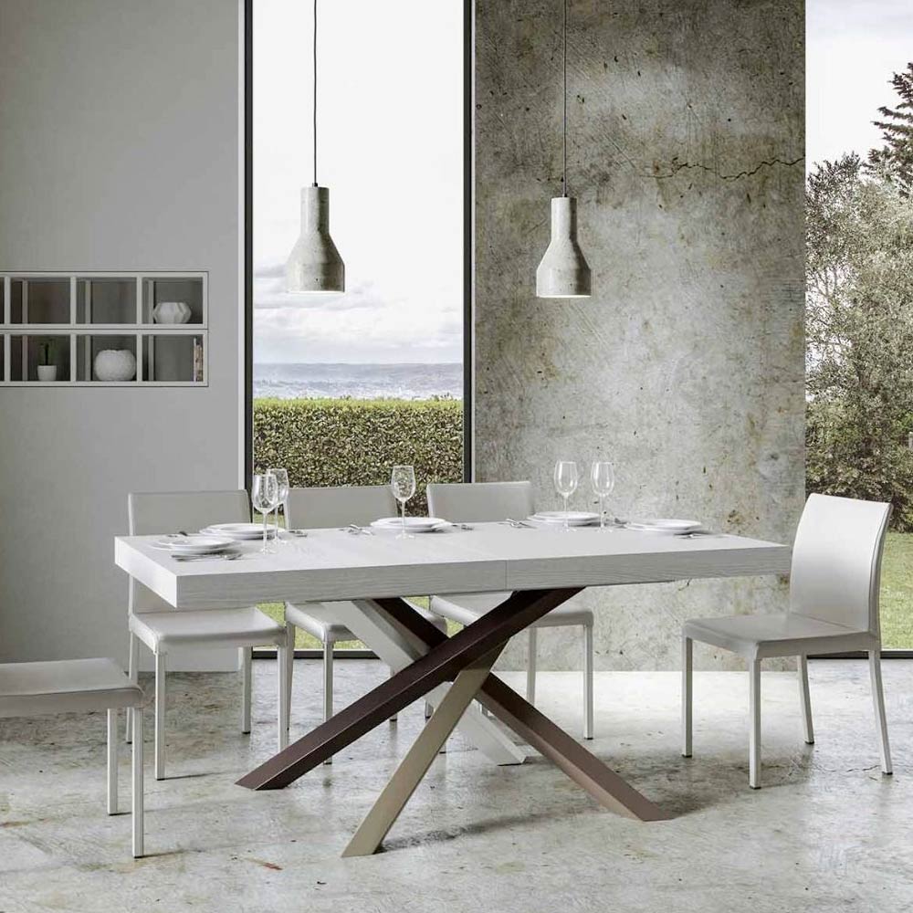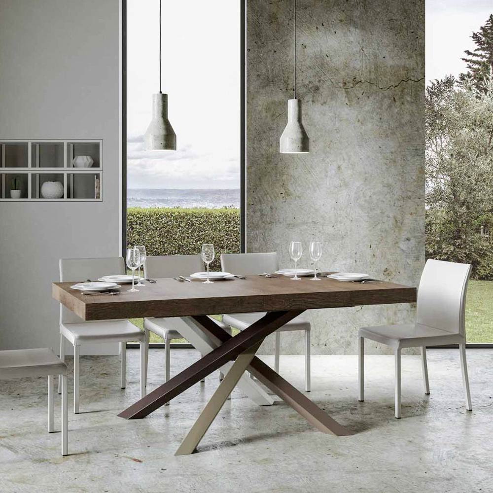 Upptäck det utdragbara bordet, ett mästerverk av modern design som sticker ut för sin unika silhuett och mångsidiga funktionalitet. Skivan i trä gör rummet ljusare och erbjuder en slät och robust yta som inbjuder till daglig användning. Bordets underrede är ett verkligt geometriskt spektakel, med korsade ben som flätas samman i en färglek. Den föreslagna kombinationen är: Ben 1: Ren vit (RAL 9010). Ben 2: Ljusbrun (RAL 8025). Ben 3: Olivgrå (RAL 7002). Ben 4: Chokladbrun (RAL 8017). RAL-färgerna är täckande. Denna kombination ger inte bara en touch av vitalitet till designen utan säkerställer också stabilitetà och styrka. Bordets förlängningsmekanism är lika enkel som den är teknisk, vilket gör att denna eleganta möbel kan förvandlas från ett praktiskt bord för fyra personer till en mysig plats för middagar och större sammankomster.