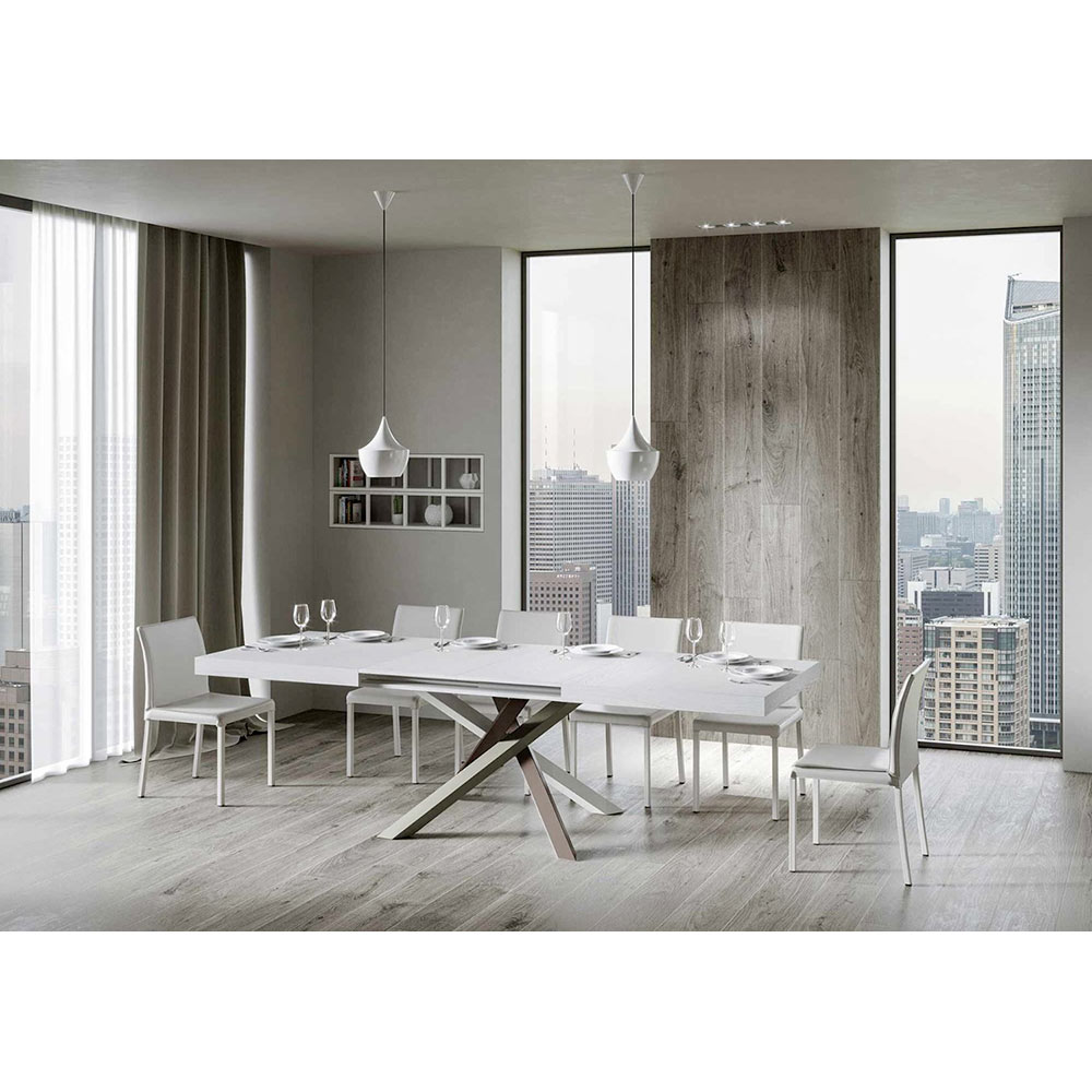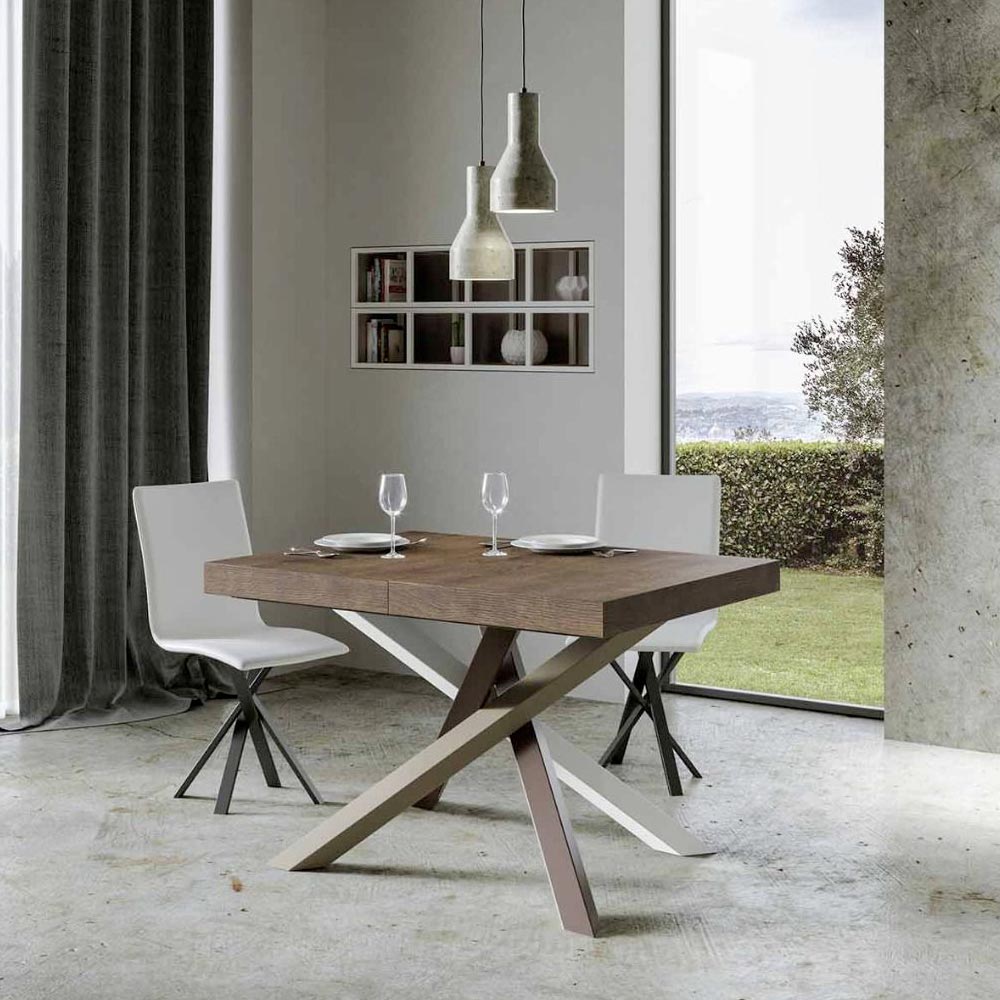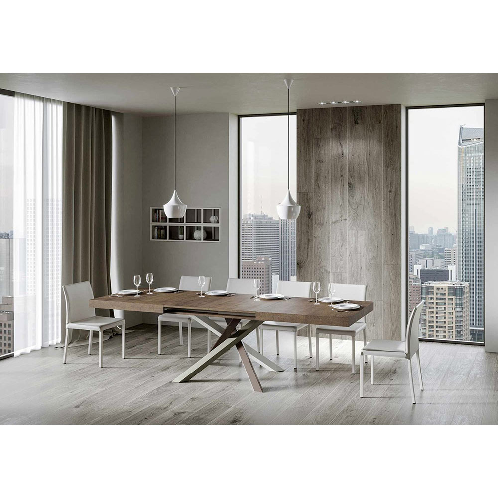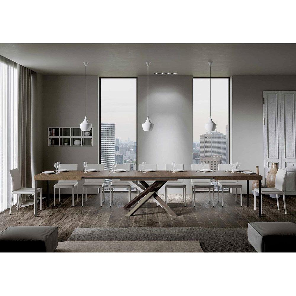 Upptäck det utdragbara bordet, ett mästerverk av modern design som sticker ut för sin unika silhuett och mångsidiga funktionalitet. Skivan i trä gör rummet ljusare och erbjuder en slät och robust yta som inbjuder till daglig användning. Bordets underrede är ett verkligt geometriskt spektakel, med korsade ben som flätas samman i en färglek. Den föreslagna kombinationen är: Ben 1: Ren vit (RAL 9010). Ben 2: Ljusbrun (RAL 8025). Ben 3: Olivgrå (RAL 7002). Ben 4: Chokladbrun (RAL 8017). RAL-färgerna är täckande. Denna kombination ger inte bara en touch av vitalitet till designen utan säkerställer också stabilitetà och styrka. Bordets förlängningsmekanism är lika enkel som den är teknisk, vilket gör att denna eleganta möbel kan förvandlas från ett praktiskt bord för fyra personer till en mysig plats för middagar och större sammankomster.