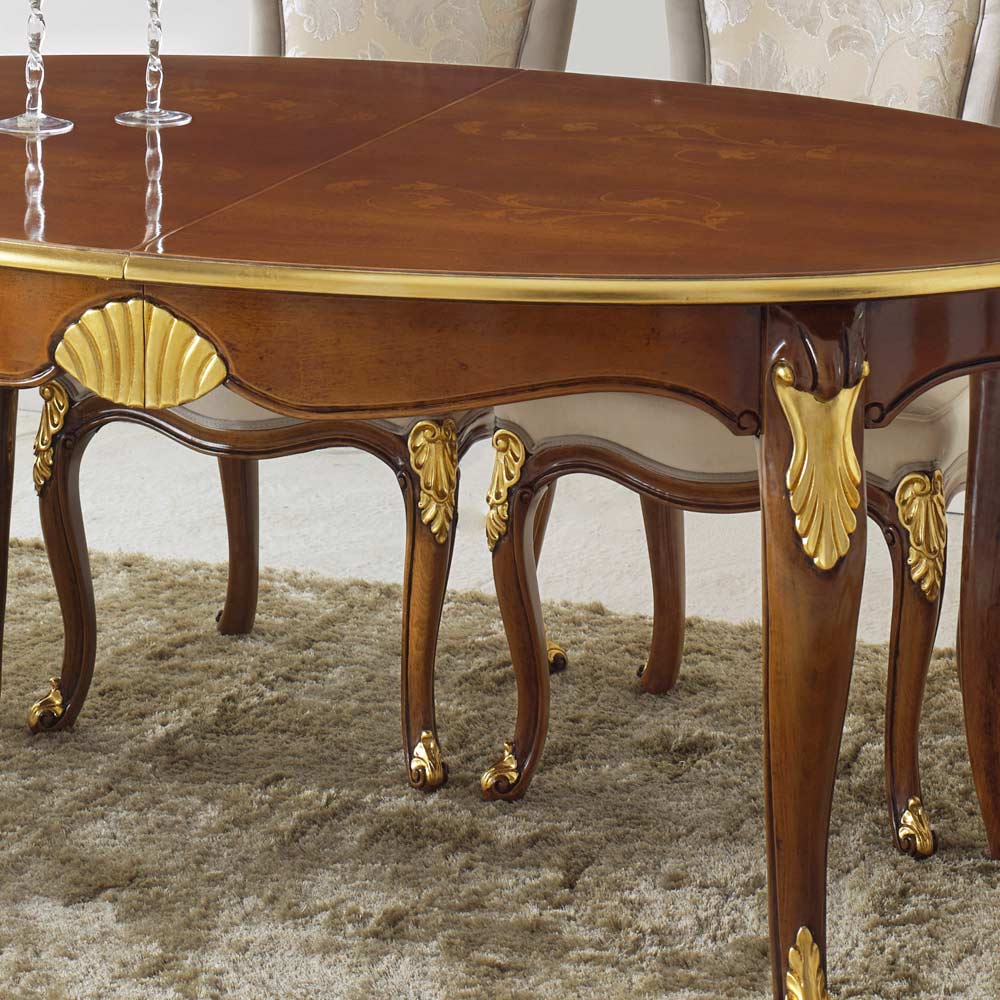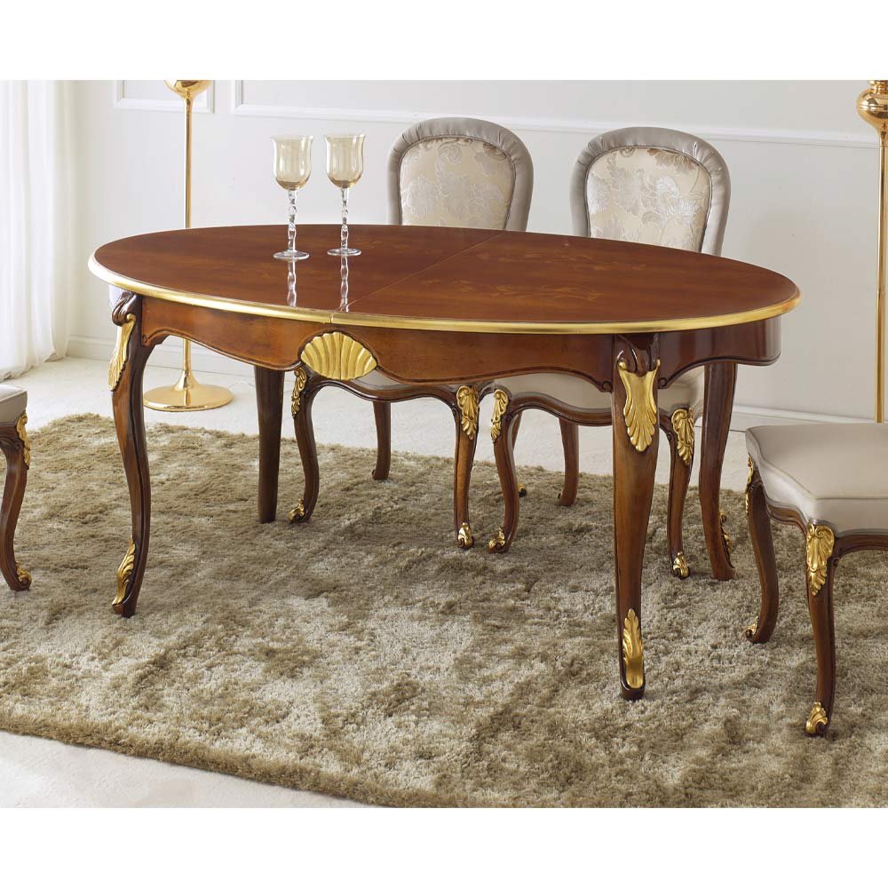 Ovalt matbord med utdragbar skiva tack vare två 50 cm invändiga förlängningar, helt i trä och finns i Bassano valnöt och antikguld eller vit och guld trä finish. Ett unikt och raffinerat komplement, helt