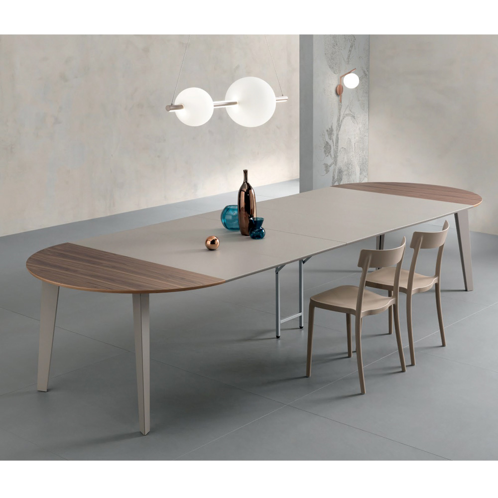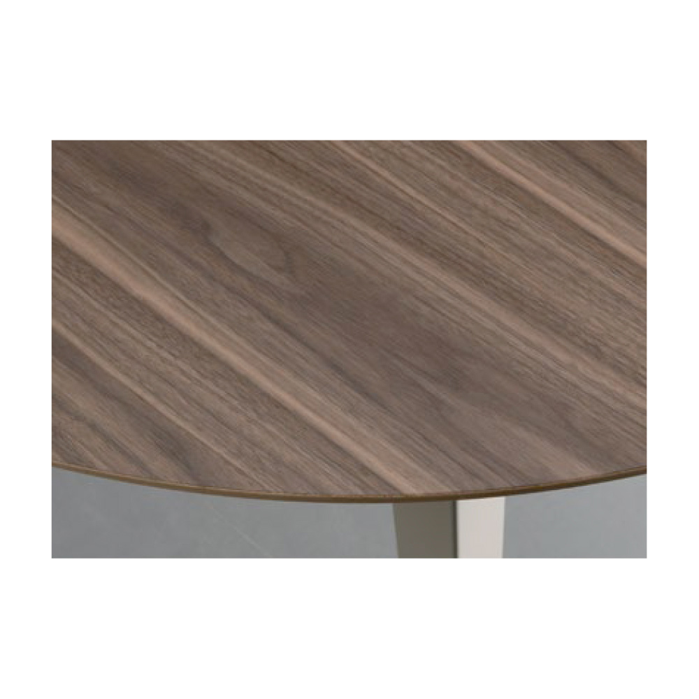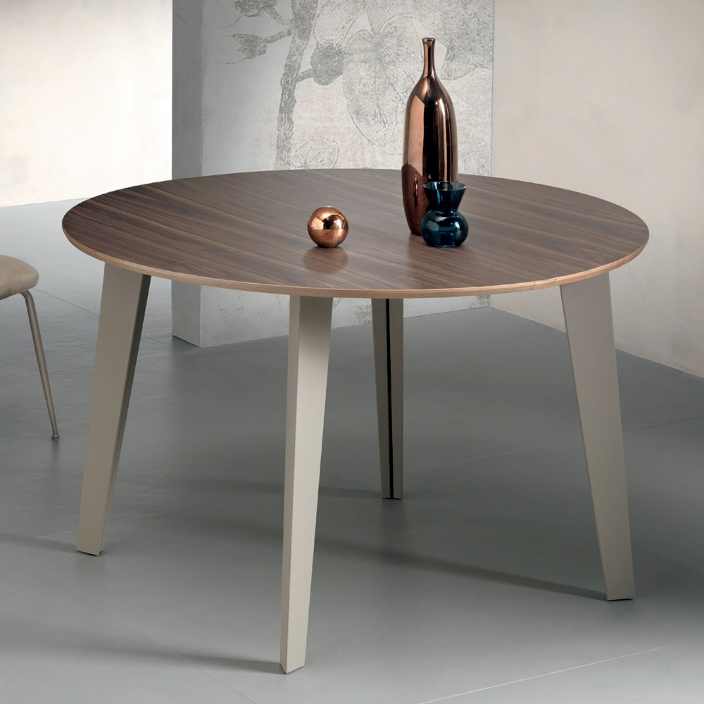 Runt bord, diameter 120 cm, utdragbart till 276 eller 380 cm, med 20 mm tjock skiva i Canaletto valnötsfaner och lutande profil.