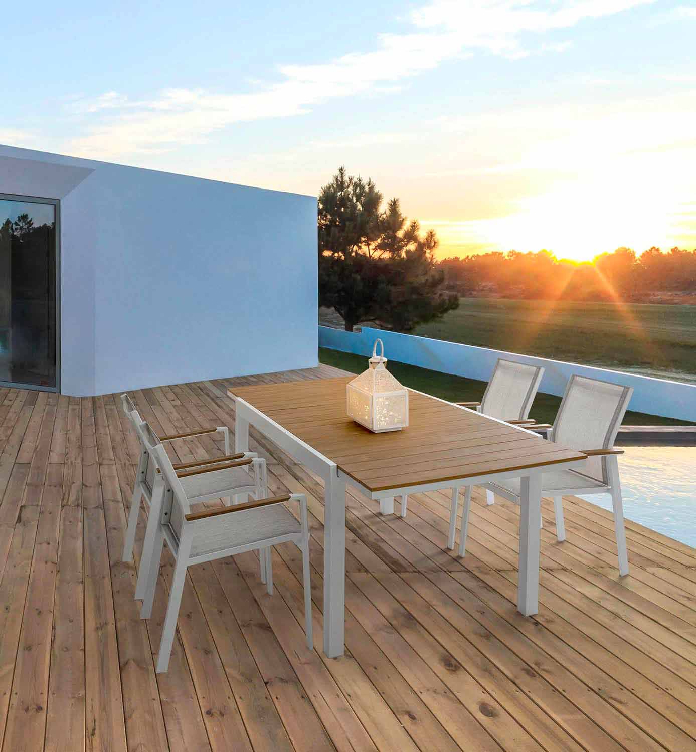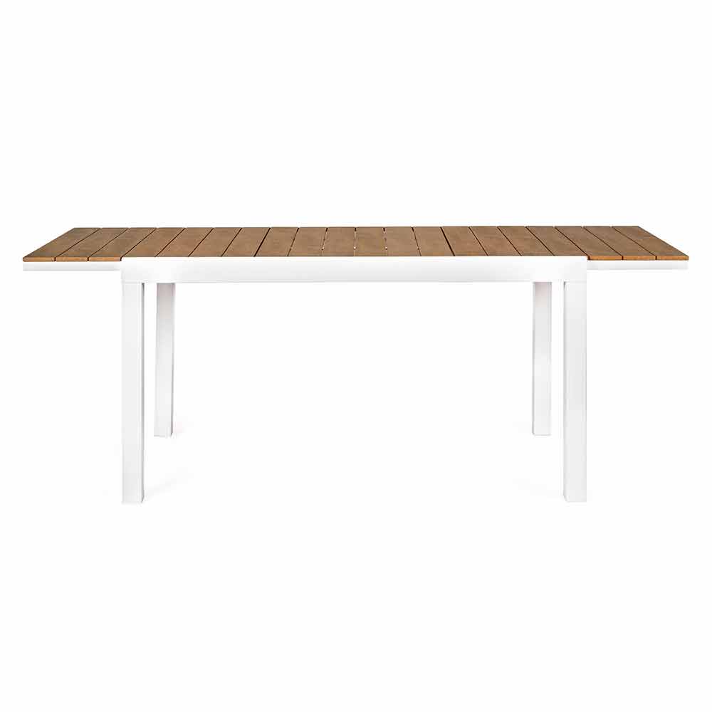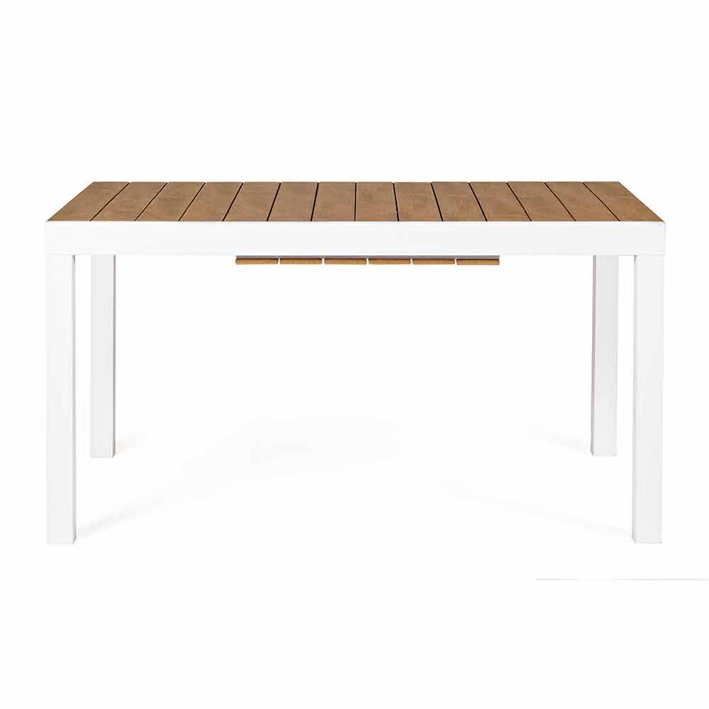 Utdragbart utomhusbord med dold central förlängning, modern design, vit aluminiumstruktur med träliknande topp.