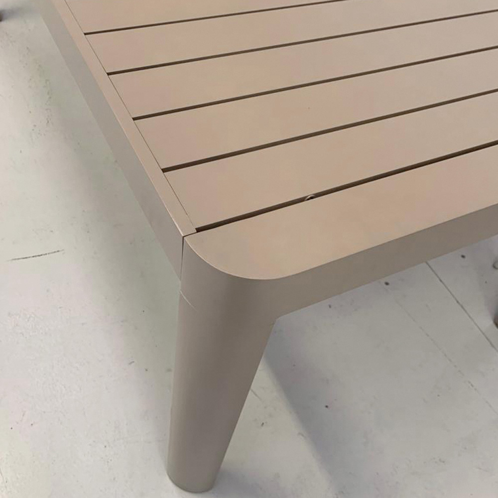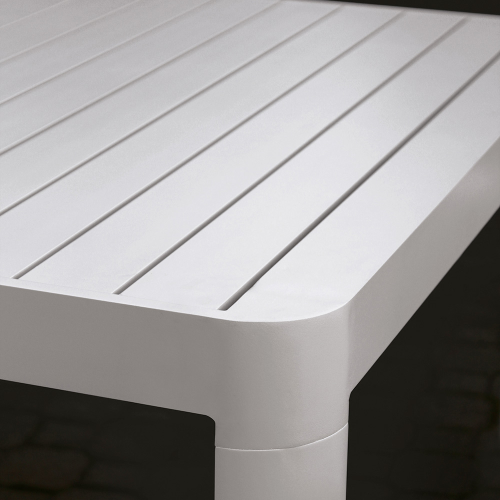 Detta utdragbara aluminiumbord är ett exempel på elegant och funktionell design perfekt för utomhusbruk. Dess finish och rena linjer framkallar en känsla av modernitet och rymlighet, och erbjuder en inbjudande yta för alla tillfällen, från familjemåltider till middagar med vänner. Aluminiumstrukturen garanterar inte bara visuell lätthet utan är också synonymt med robusthet och motstånd .
