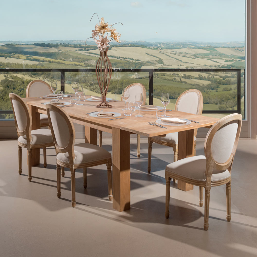 Detta utdragbara bord i massiv teak är en praktisk och elegant inredningslösning, perfekt för matsalen eller köket. Den robusta strukturen och hantverket framhäver träets naturliga ådring , vilket ger värme och karaktär till utrymmet.