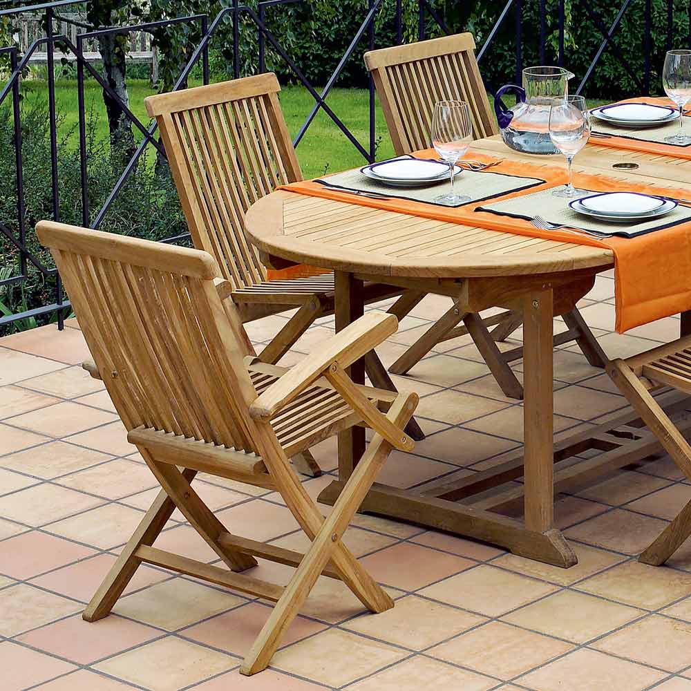 Utdragbart trädgårdsbord i teak med stolar och fåtöljer.