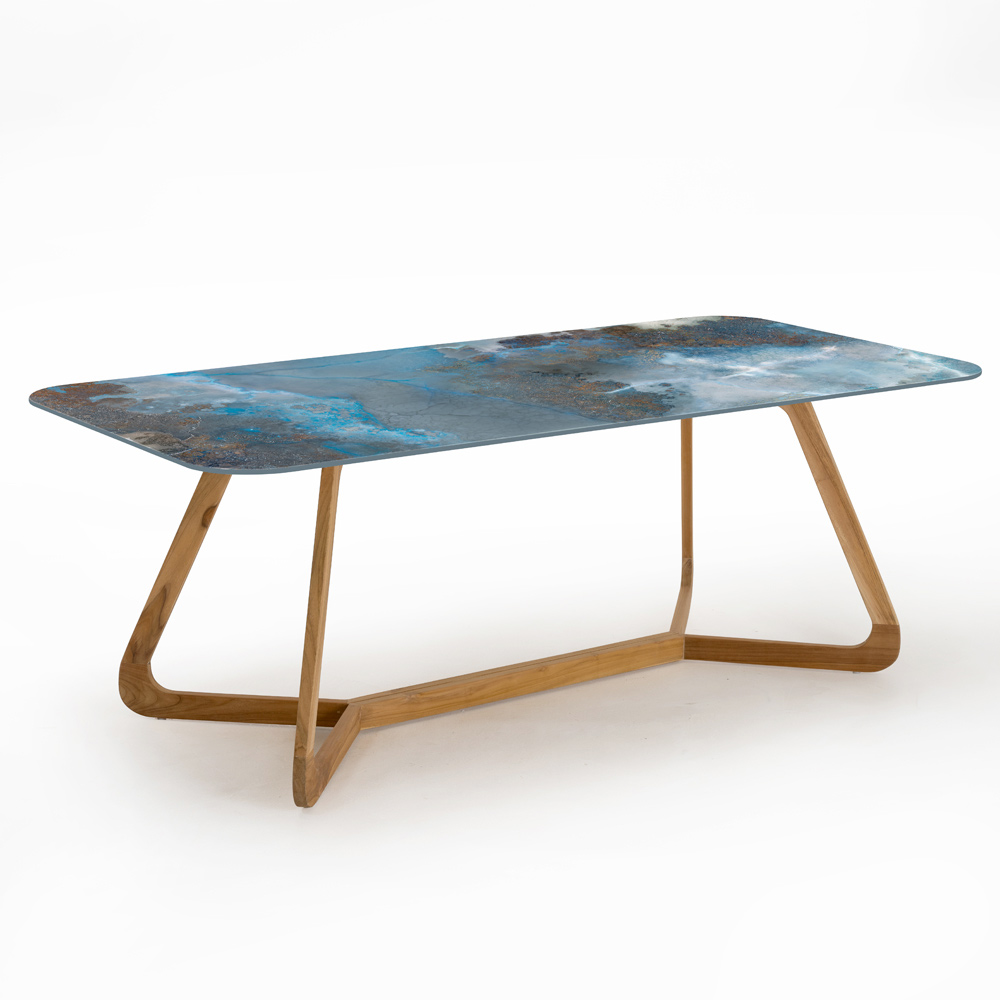 tillverkad i Italien. Detta utomhusbord är en perfekt blandning av naturlig elegans och modern konst. Bordsskivan, tillverkad av högkvalitativ keramik, har en unik finish som efterliknar de organiska texturerna och de livfulla färgerna i en klippformation, med nyanser av blått, grått och kopparfärgat. Denna yta är inte bara iögonfallande utan också extremt hållbar, perfekt för dagligt utomhusbruk.