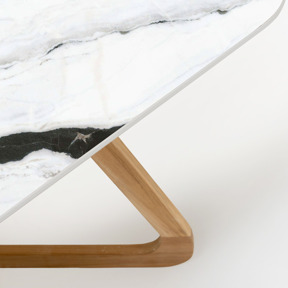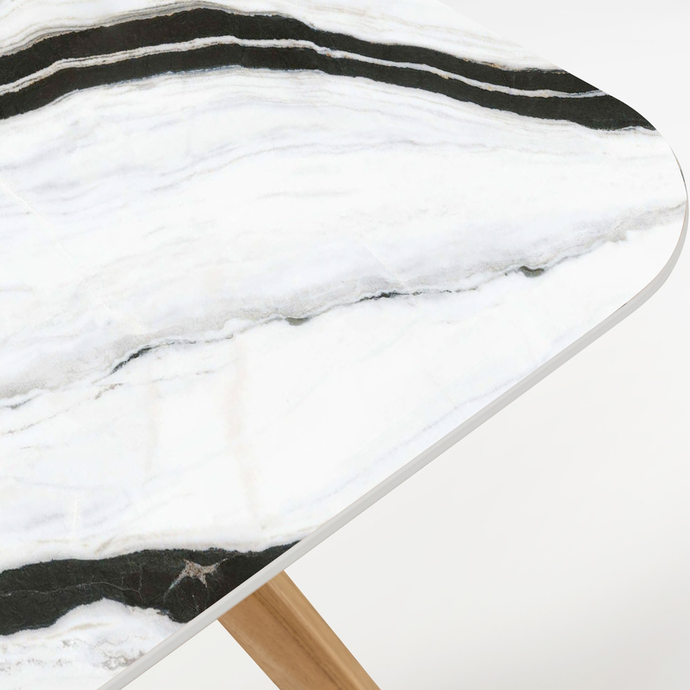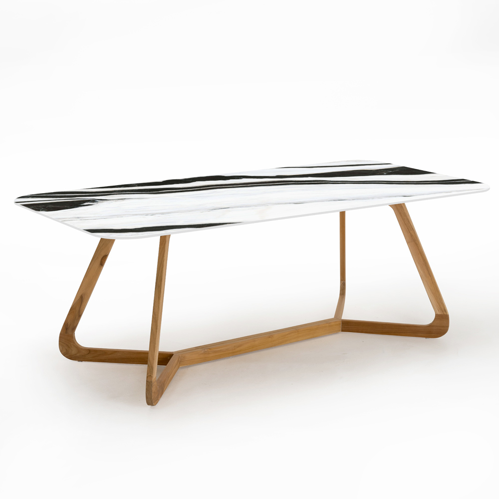 tillverkad i Italien. Detta utomhusbord är ett sant mästerverk inom design, som kombinerar träets värme med den eleganta renheten hos Panda White- keramik. Denna slående bordsskiva, med djärv svart ådring mot en ren vit bakgrund, är inte bara visuellt tilltalande utan också otroligt hållbar och lätt att underhålla, perfekt för alla utomhusmiljöer.