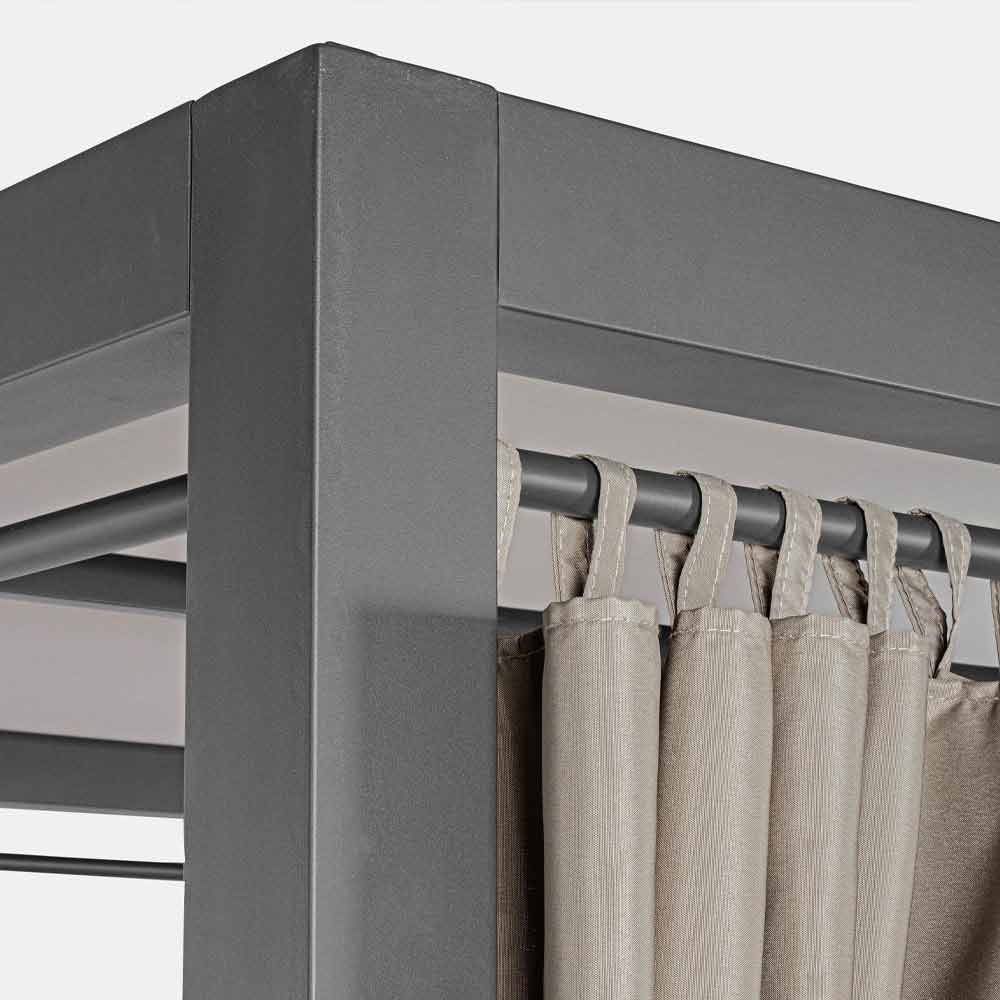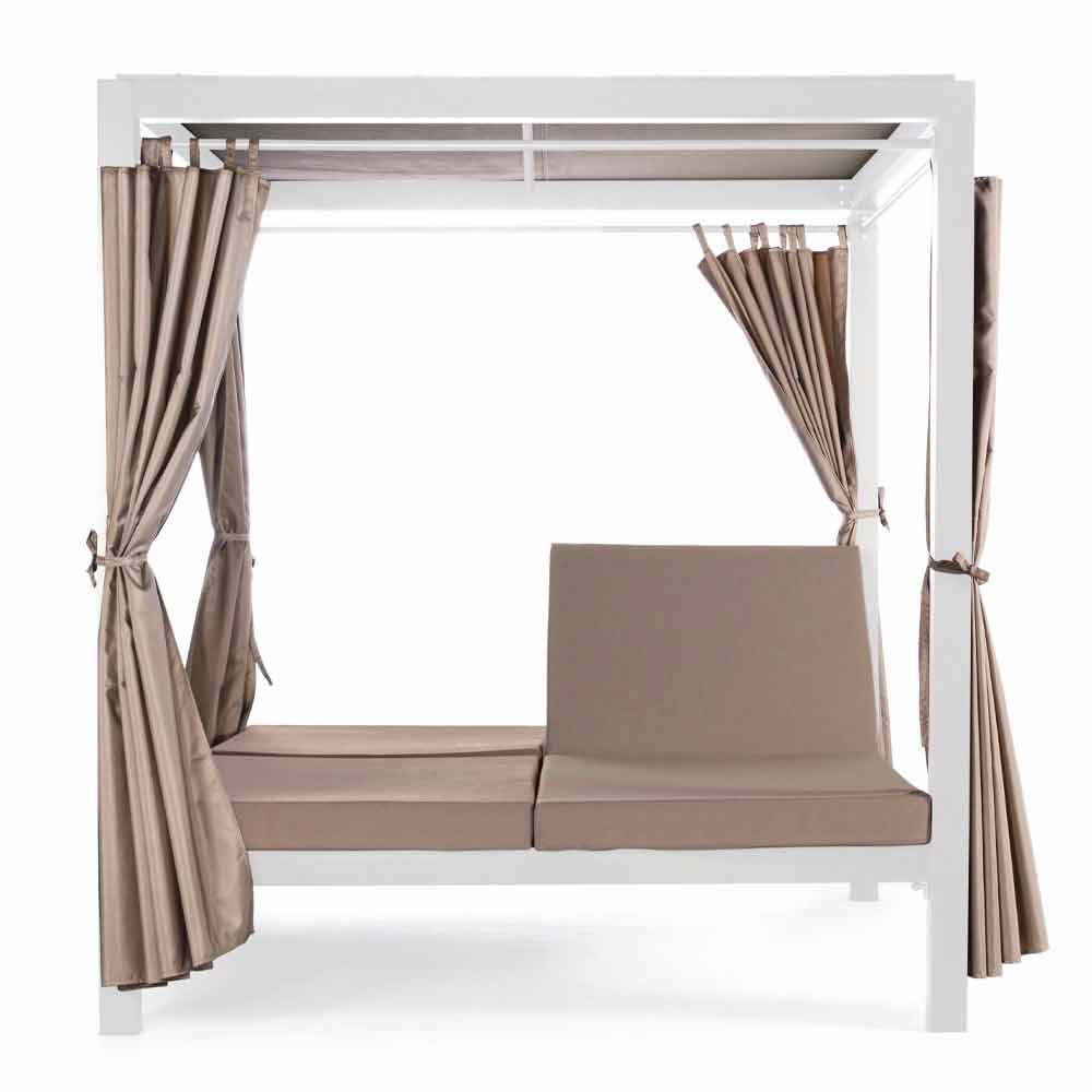 Pulverlackerad aluminiumkonstruktion , 80x80mm stolpar, takduk och sittdynor (avtagbara) i 1x1 textilin , snabbtorrt skumvadd för utomhusbruk. 4-läges ryggstöd och sidogardiner i polyester . Att monteras.