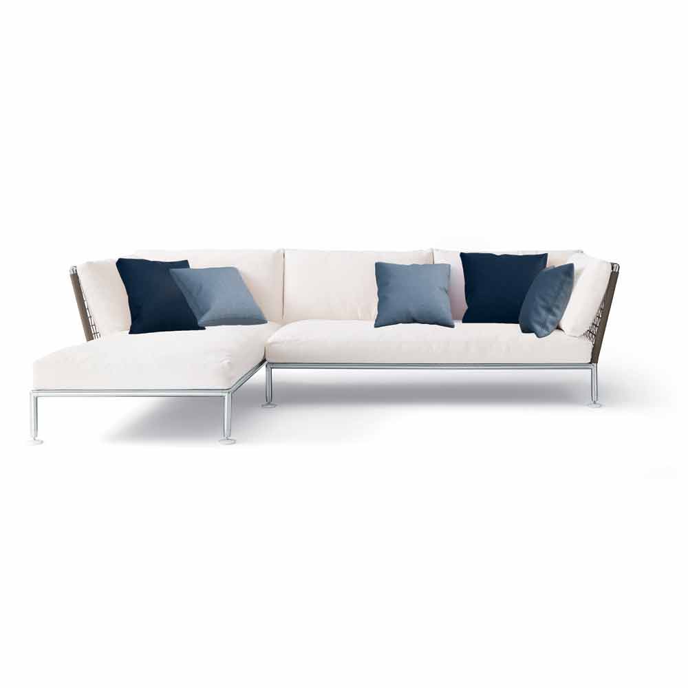 Hörnsoffa med schäslong utomhus, i stål och vitt eller duvgrått tyg, av modern design tillverkad i Italien.
