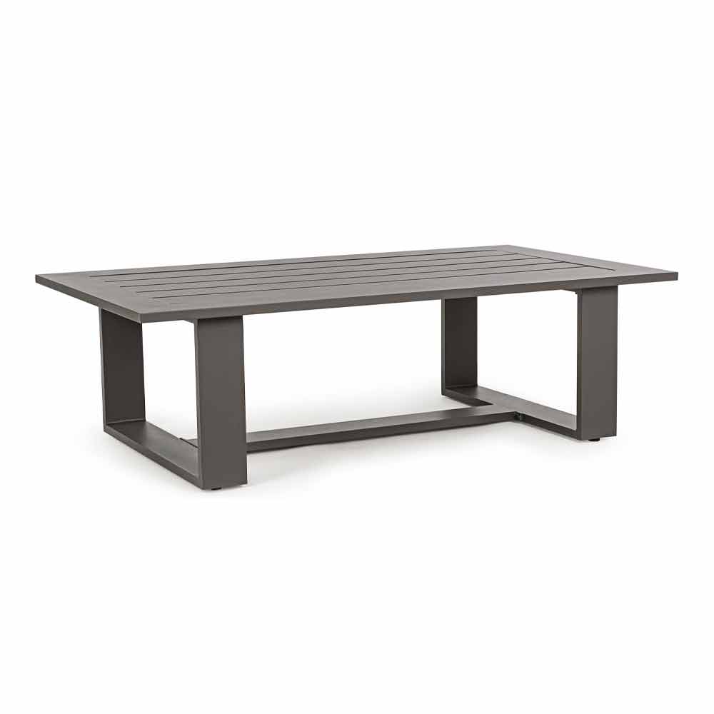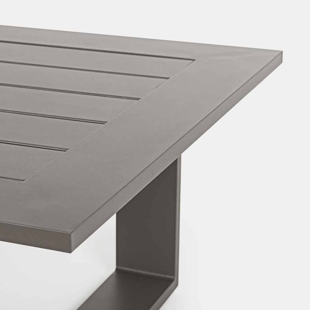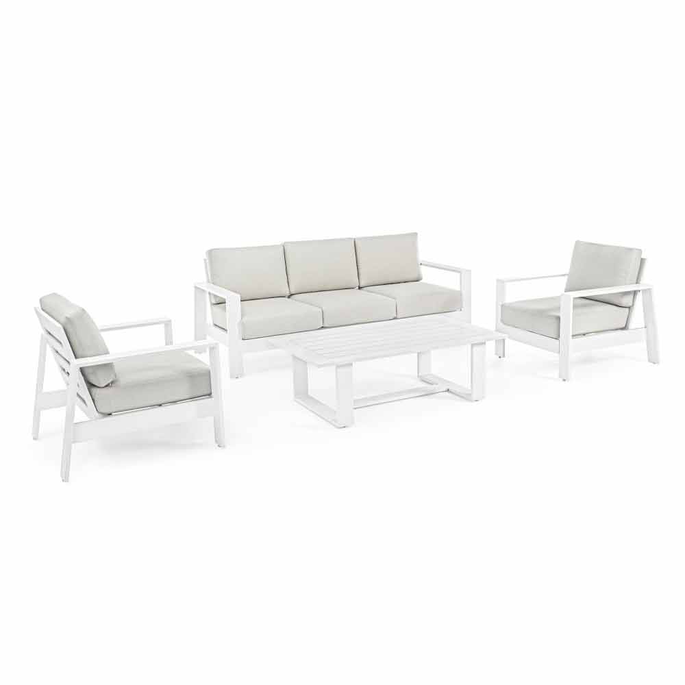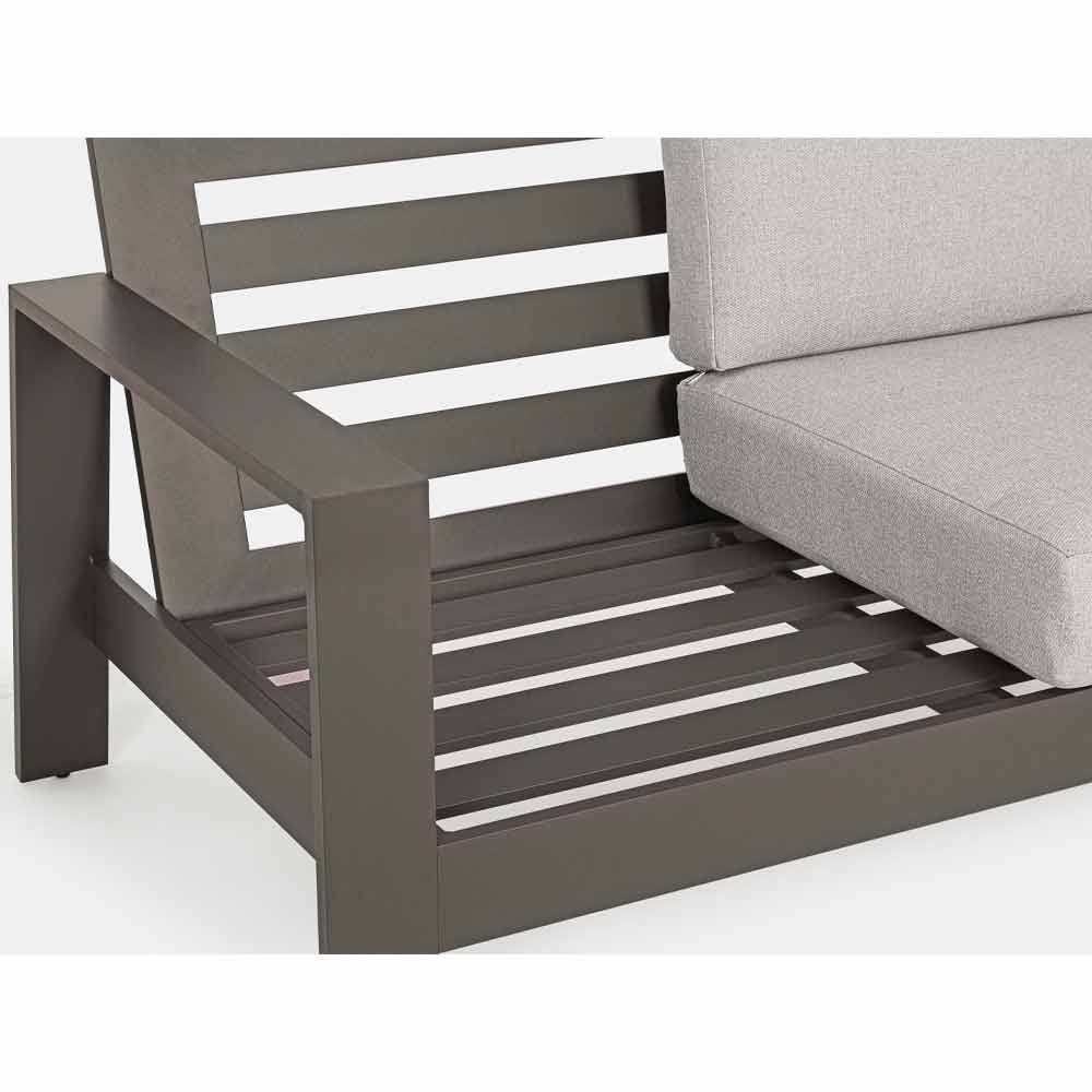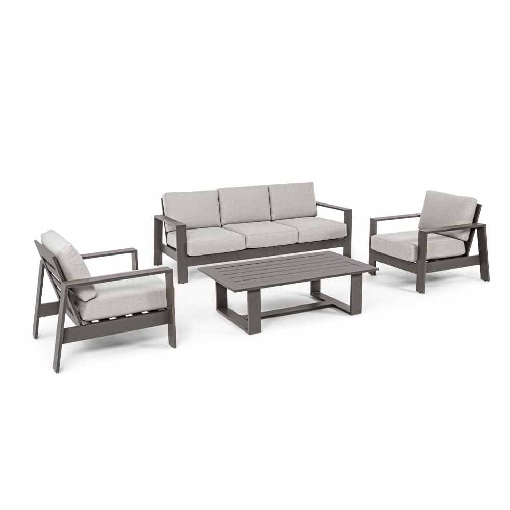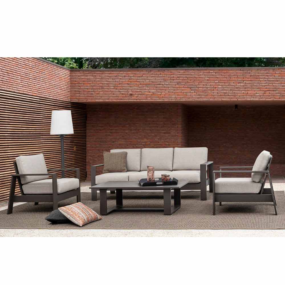 Uteservering med soffa, fåtöljer och soffbord i aluminium.