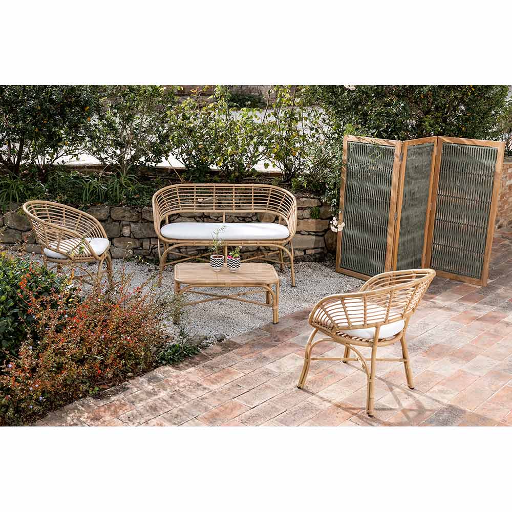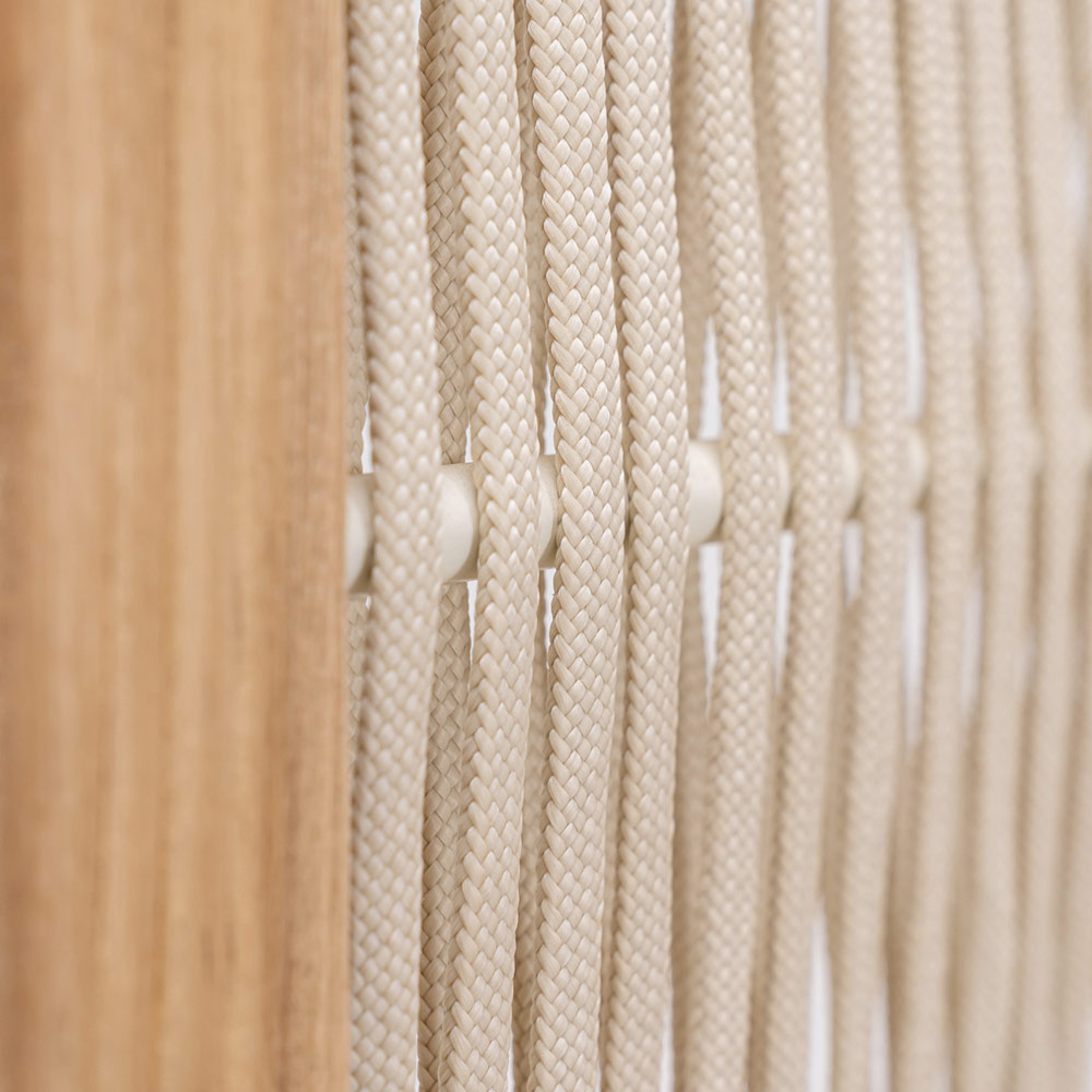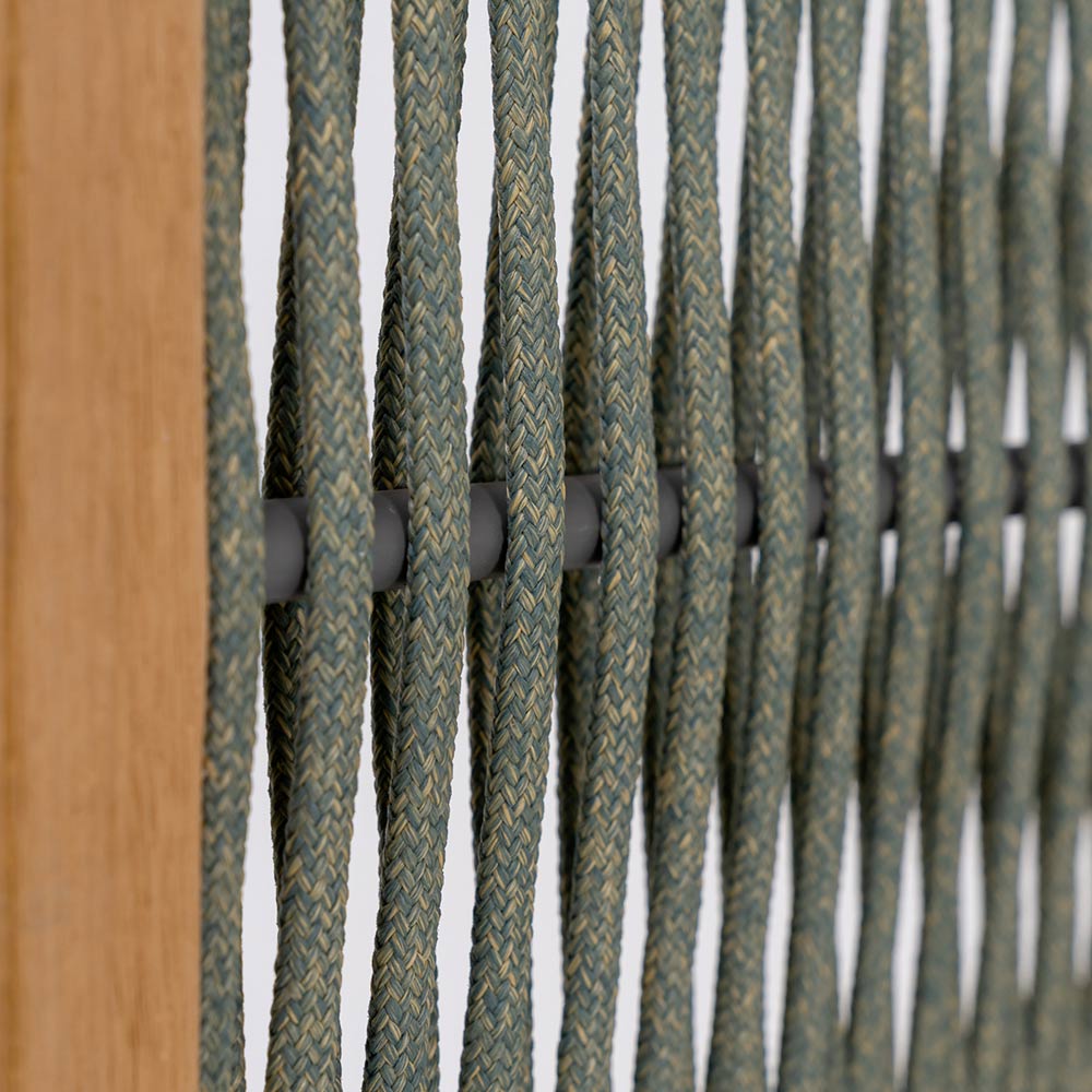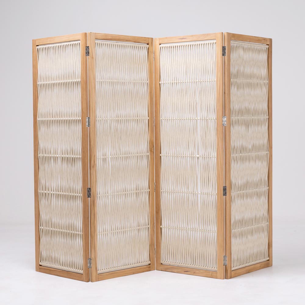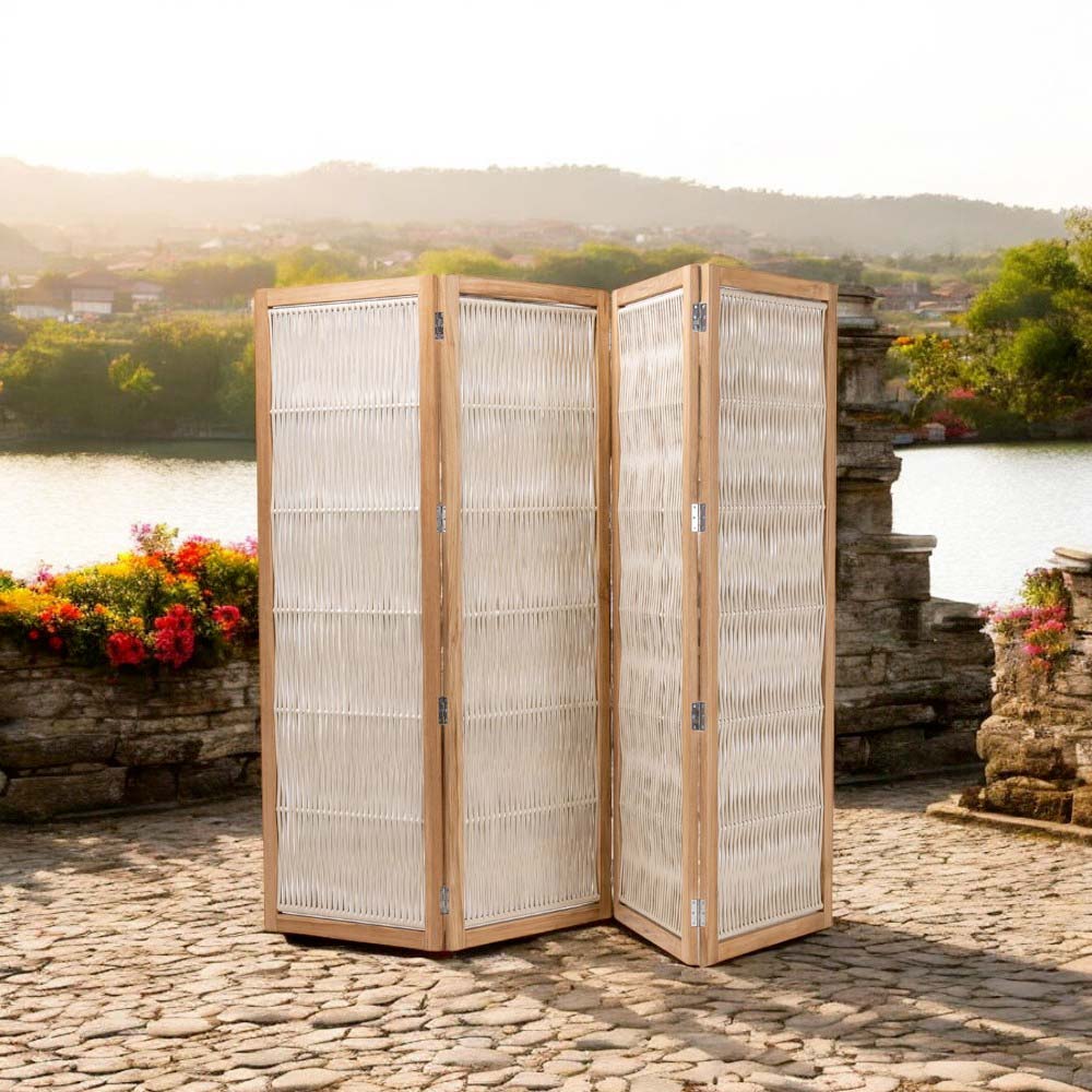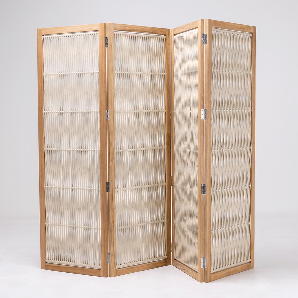 Den här trädgårdsavdelaren representerar en elegant designlösning för att definiera utomhusutrymmen och erbjuder en kombination av privacy och stil. Teak- och aluminiumstrukturen smälter samman med vävt rep-paneler, vilket kombinerar värmen i det organiska materialet med funktionaliteten hos en mobil skiljevägg.