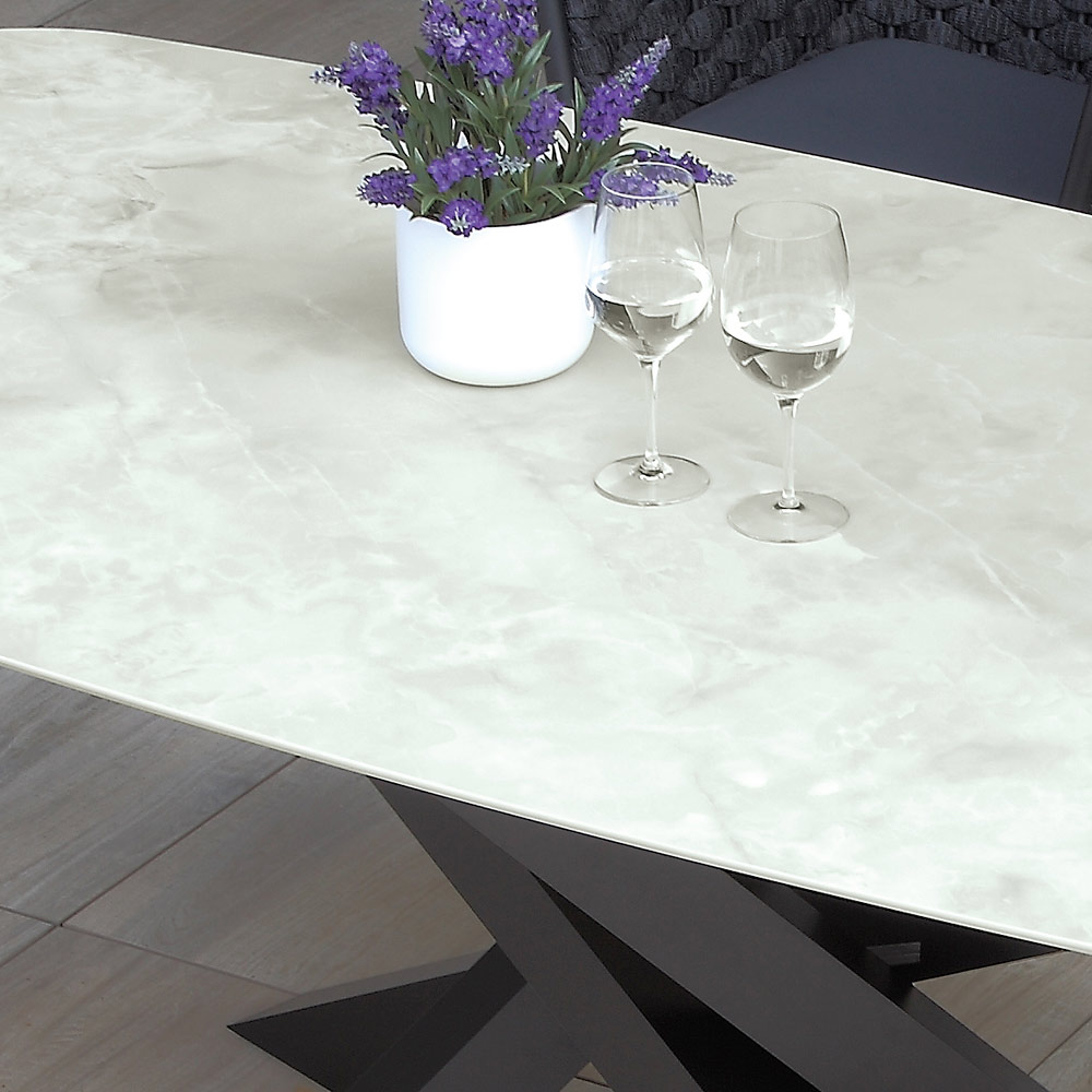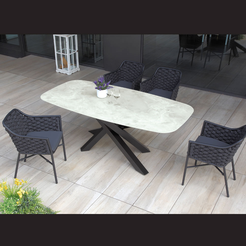 Detta trädgårdsbord kombinerar elegant design och överlägsen motståndskraft , perfekt för att förse alla utomhusmiljöer med stil. Dess målade aluminiumstruktur , solid och med ett modernt snitt, kombineras med en raffinerad topp i skiktad HPL , känd för sin extrema hållbarhet och motståndskraft mot atmosfäriska ämnen , repor och värme.