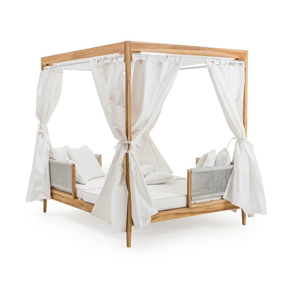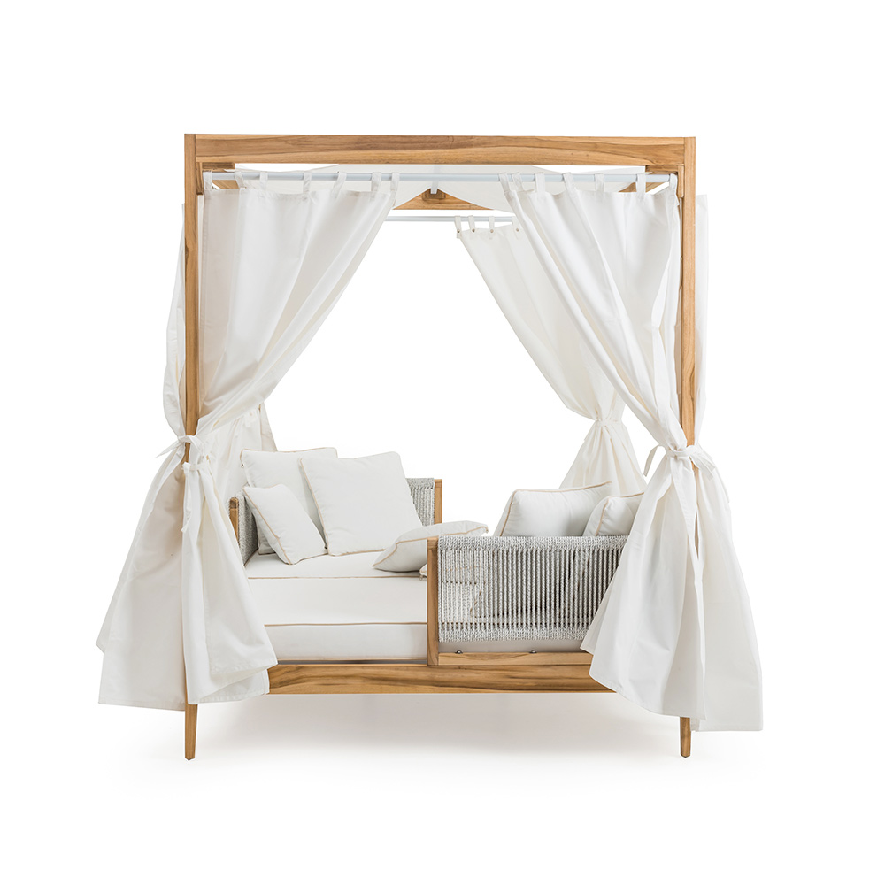 En dagbädd utformad för dem som söker en nykter och elegant stil som kan ge sina utomhusutrymmen en accent av friskhet. Denna baldakin lämpar sig för att berika trädgårdar, terrasser och verandor på ett oklanderligt sätt och är också perfekt vid poolen där den skapar en underbar välkomnande atmosfär och perfekt harmoni med den omgivande miljön. Dess raffinerade design gör den till ett perfekt komplement för att komplettera med karaktär och stil alla utomhusutrymmen, både privata och kontrakt, vilket ger liv åt en exklusiv och detaljerad inredning .