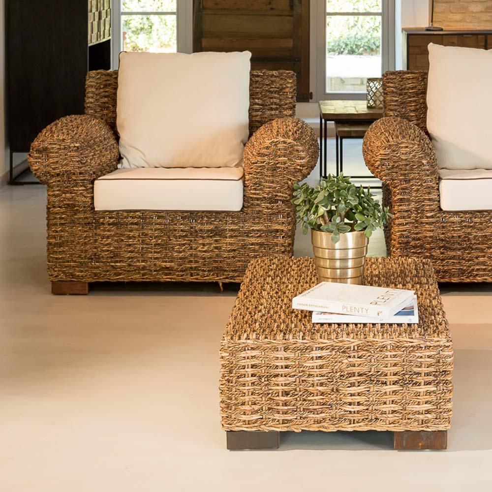 fåtöljen tillhör en hel kollektion som görs unik genom de rundade cylindriska armstöden och en raffinerad tät väv av naturlig abaca-fiber, som härrör från bananträdet . Sätena är stora och försedda med bekväma kuddar .