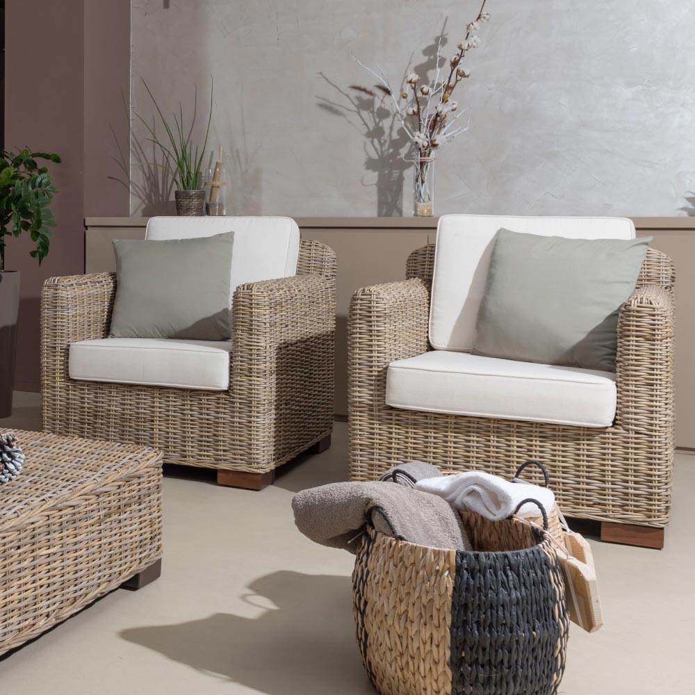 Utomhusfåtölj tillverkad i handvävd grå kubu med standard kuddar inkluderade i standard " Ecru " finish. Kubu är ett av de mest resistenta naturmaterialen som finns i naturen, men det förblir alltid mycket lätt .