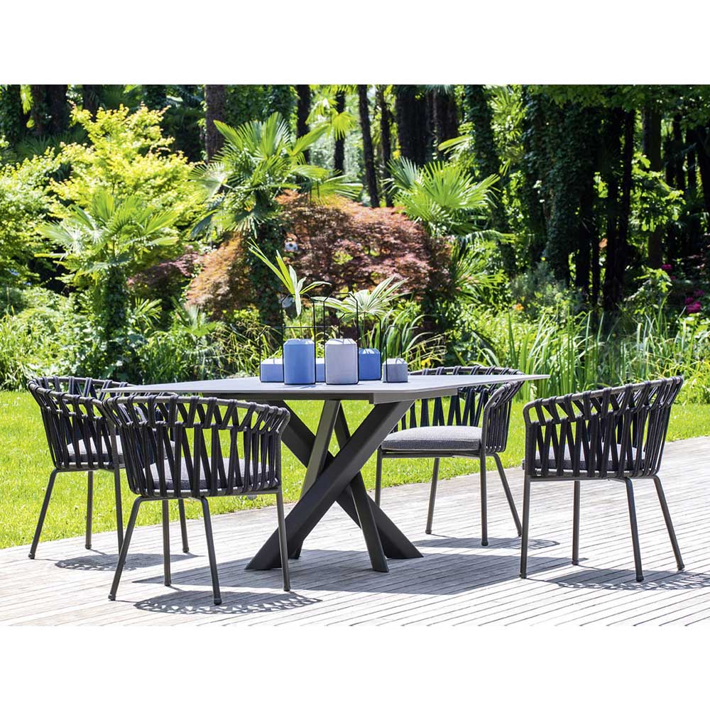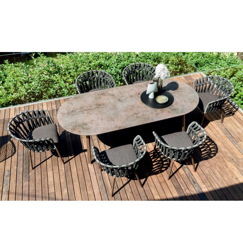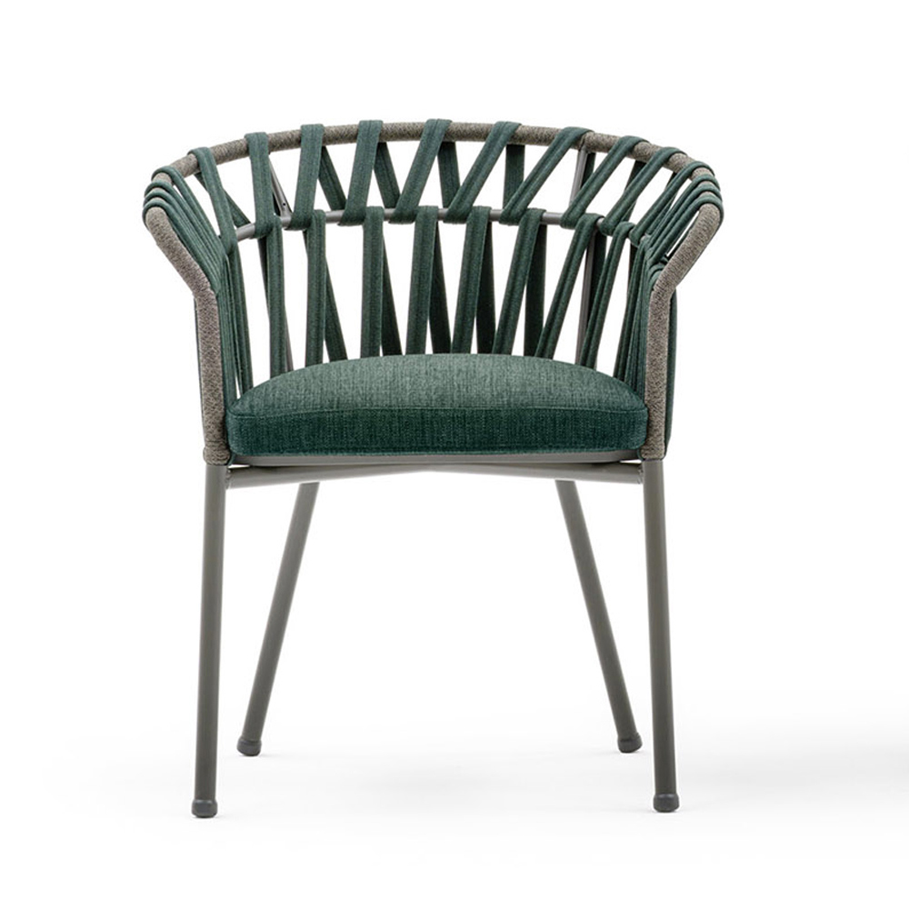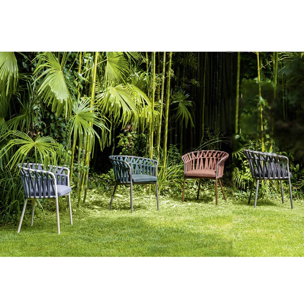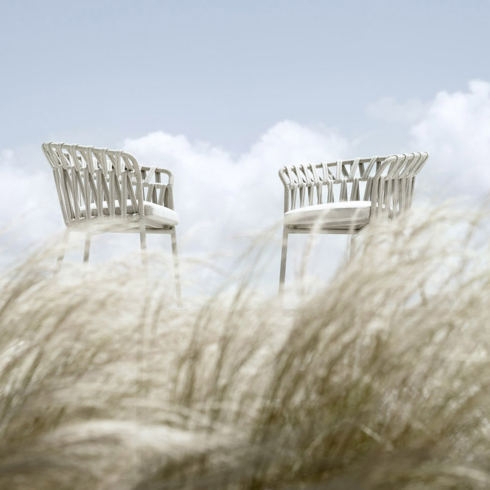 Dess design är inspirerad av de eleganta och lätta formerna på kronan av en blomma och görs unik av vävningen som skapas efter ett speciellt geometriskt mönster som perfekt matchar strukturens känsliga och omslutande form som välkomnar och slappnar av. Det som föds är en fräsch och innovativ inredningslösning berikad av de underbara raffinerade nyanserna tack vare vilka den utomhusnaturlighet förvandlas till modern elegans.