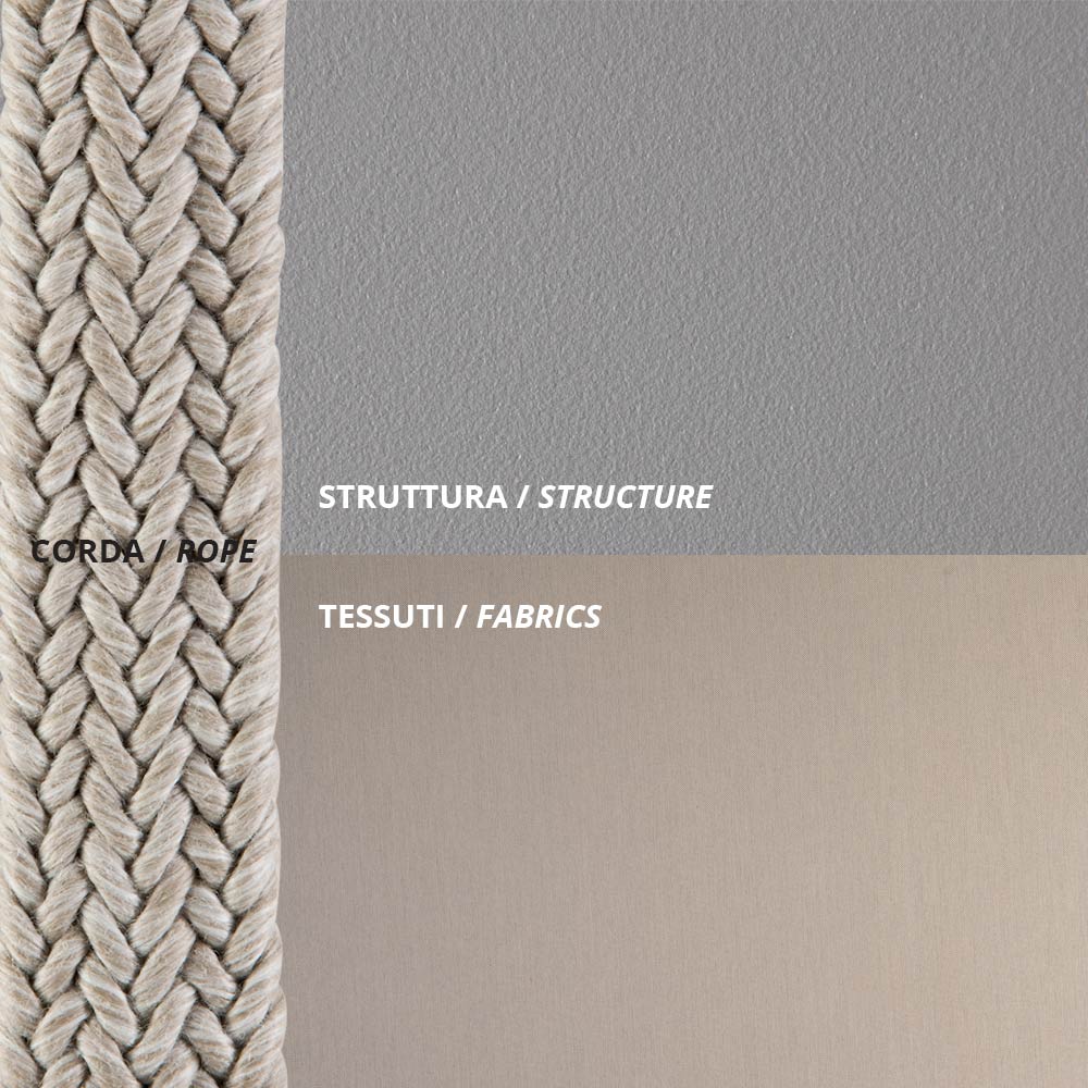 motståndskraft mot korrosiva atmosfäriska ämnen, medan repet är resistent mot klor och solstrålar samt mögelskyddande. Dynorna är tillverkade av ett material som är resistent mot UV-strålar och vatten och som behåller färgen länge.