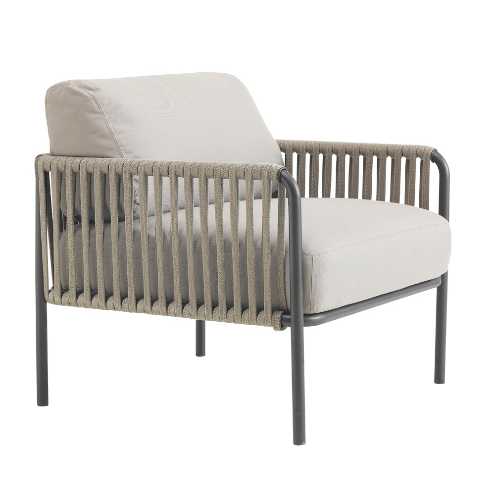 Utomhusfåtölj i stål och rep med kuddar Tillverkad i Italien.