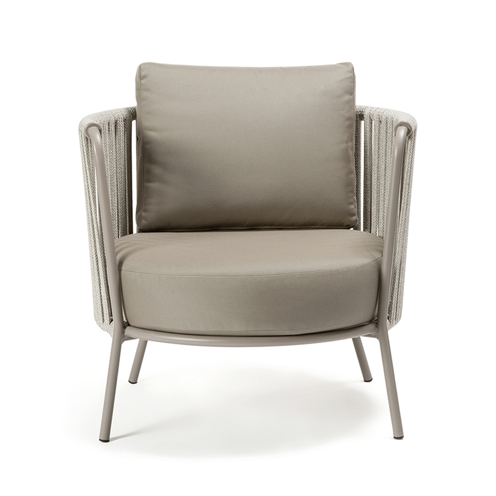 motståndskraft mot korrosiva atmosfäriska ämnen, medan repet är resistent mot klor och solljus samt mögelskyddande. Dynorna är tillverkade av ett material som är resistent mot UV-strålar och vatten och som behåller färgen länge, vilket gör fåtöljen till ett perfekt element för att inreda alla utomhusmiljöer.