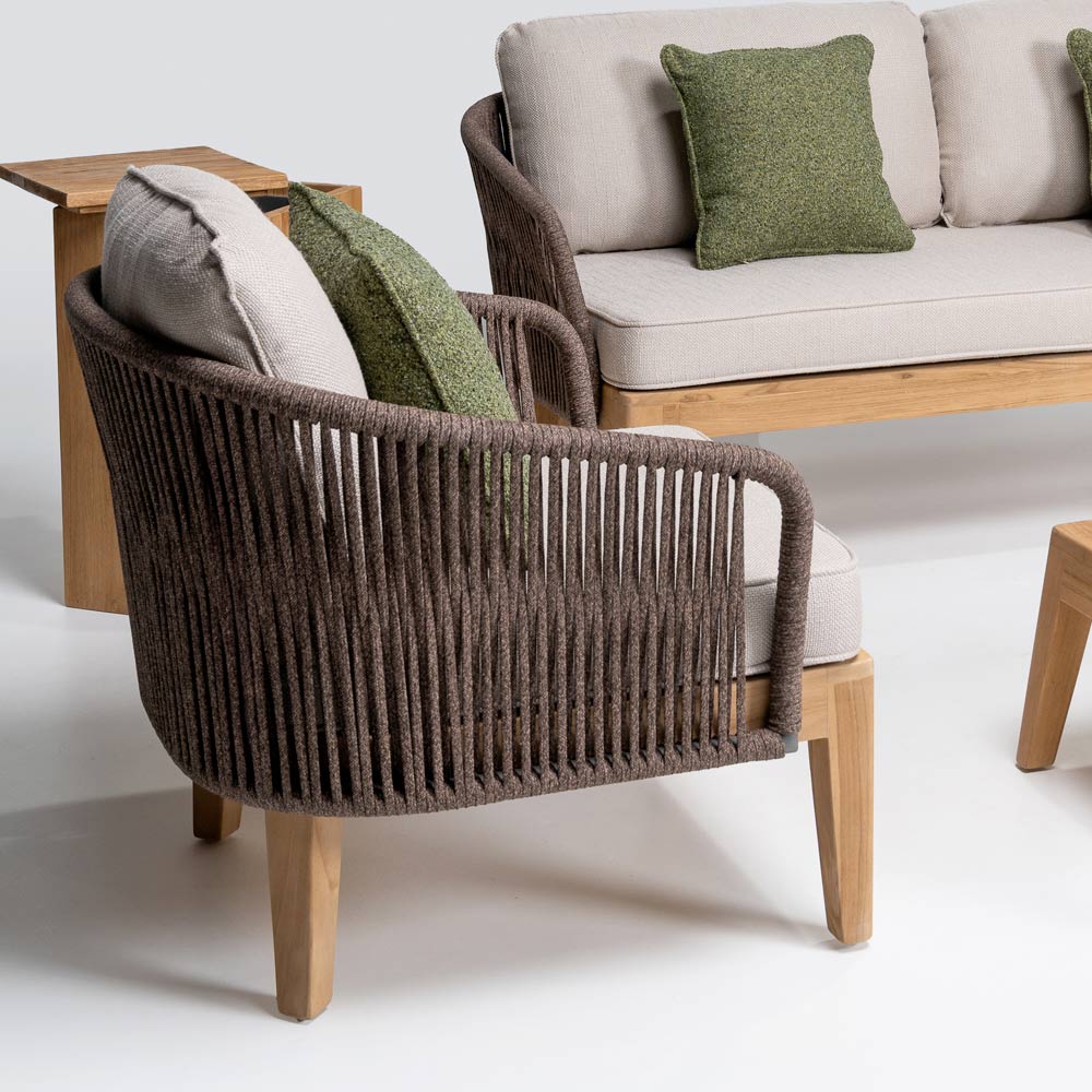 Utomhusfåtölj i teakträ och polyetenväv med dynor.
